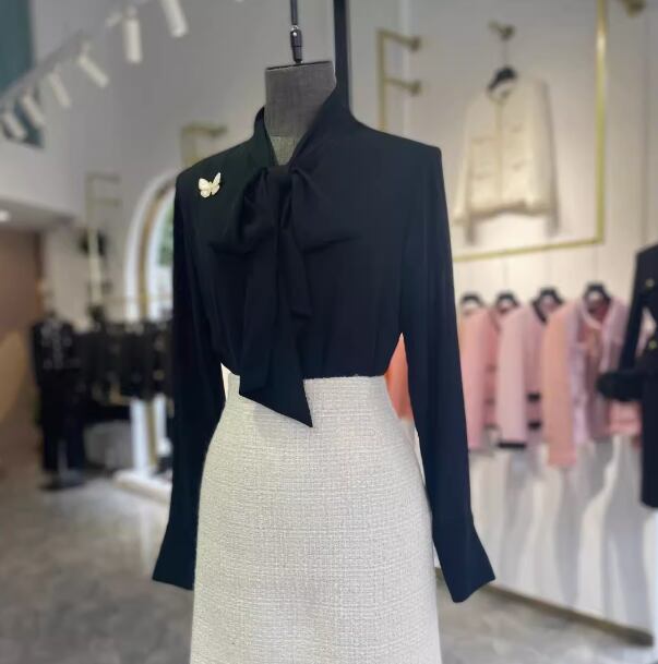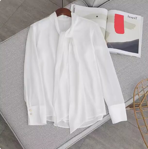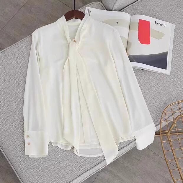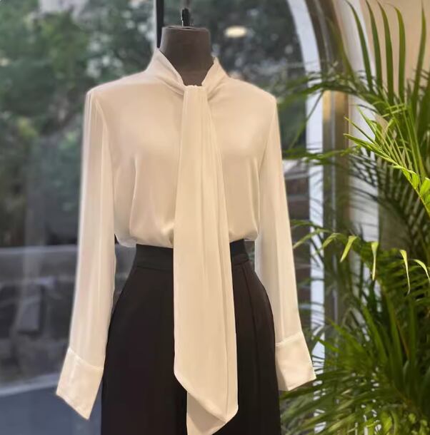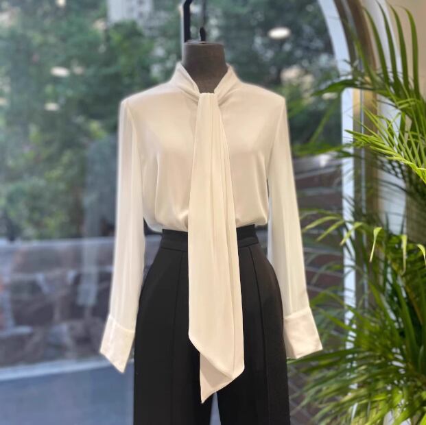 フェミニンで上品な雰囲気も漂う、ボウタイブラウスの登場です。清潔感を引き立て、オフィスや通勤服にも最適な一枚。ボウタイリボンのアクセントが華やかさを加え、女性らしいスタイルを演出します。