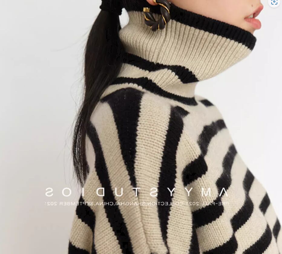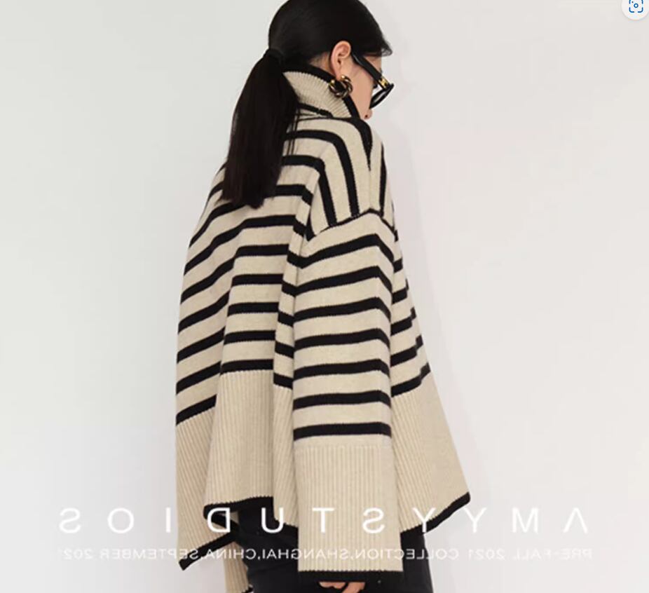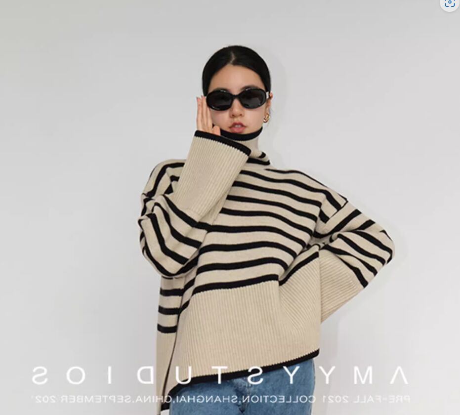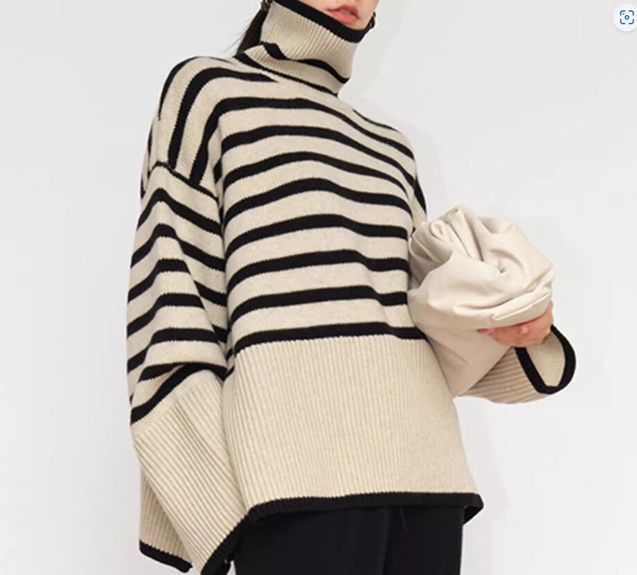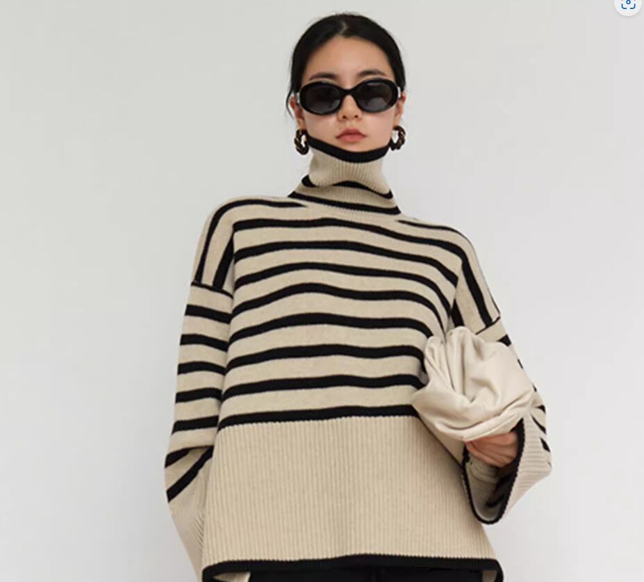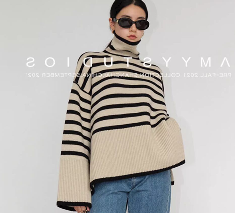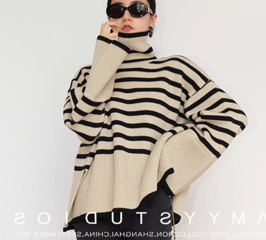 ゆったりシルエットで着心地のいいタートルネックボーダーニット