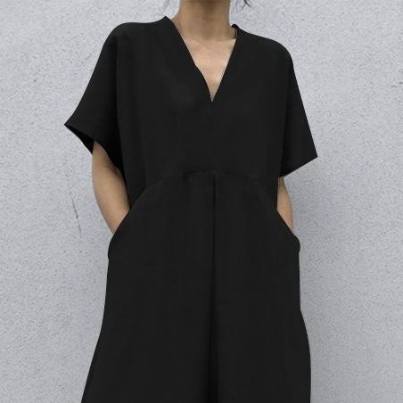 このロング丈ワンピースは、Vネックとウエストマークが女性らしいシルエットを演出してくれます。