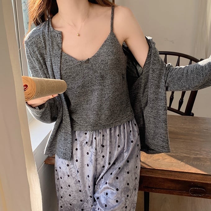 カーディガン、キャミソール、ロングパンツの組み合わせなので、季節や気分に合わせてコーディネートが楽しめます。