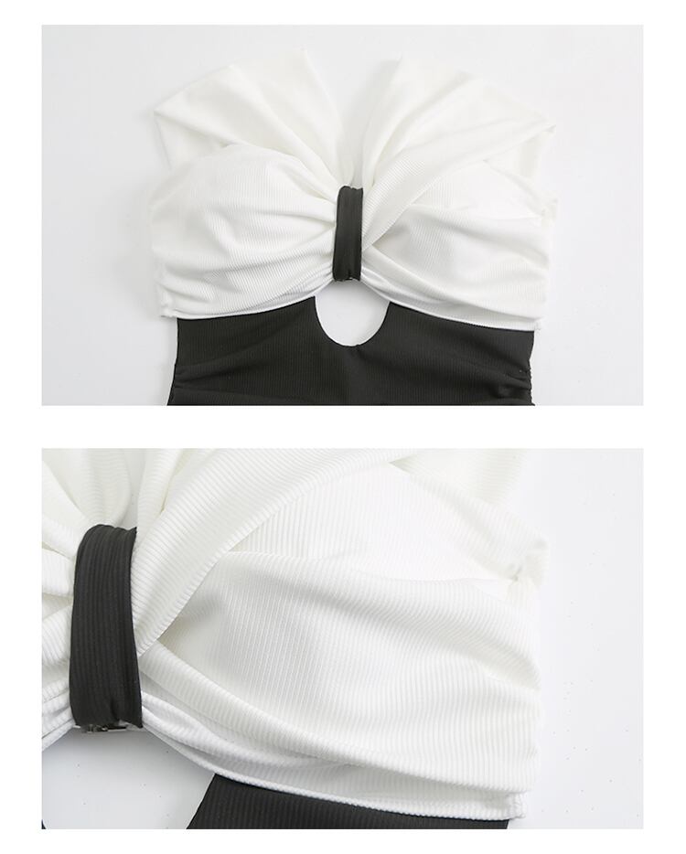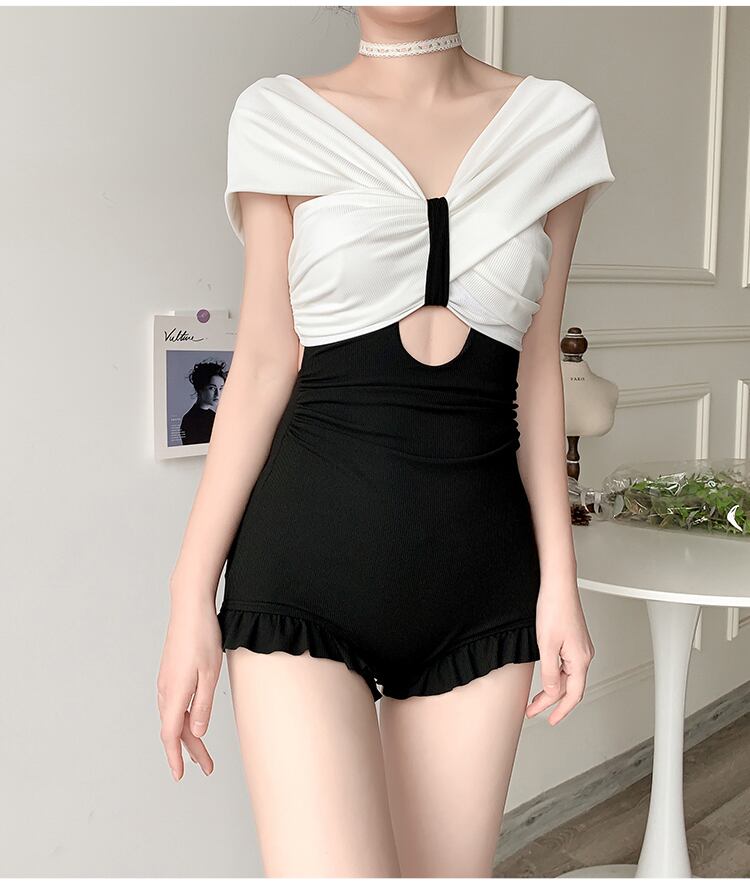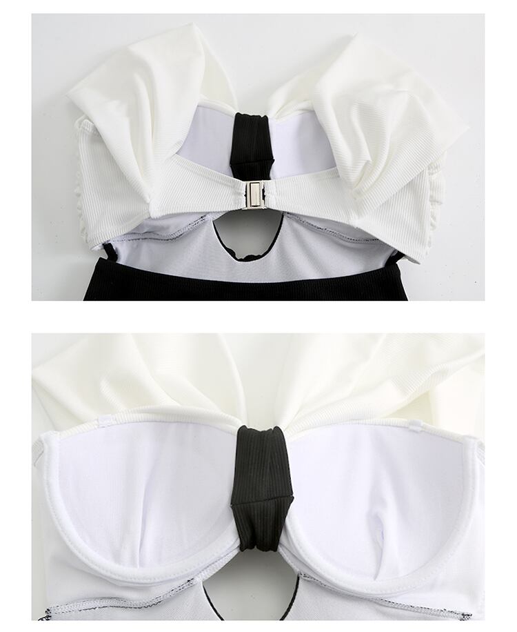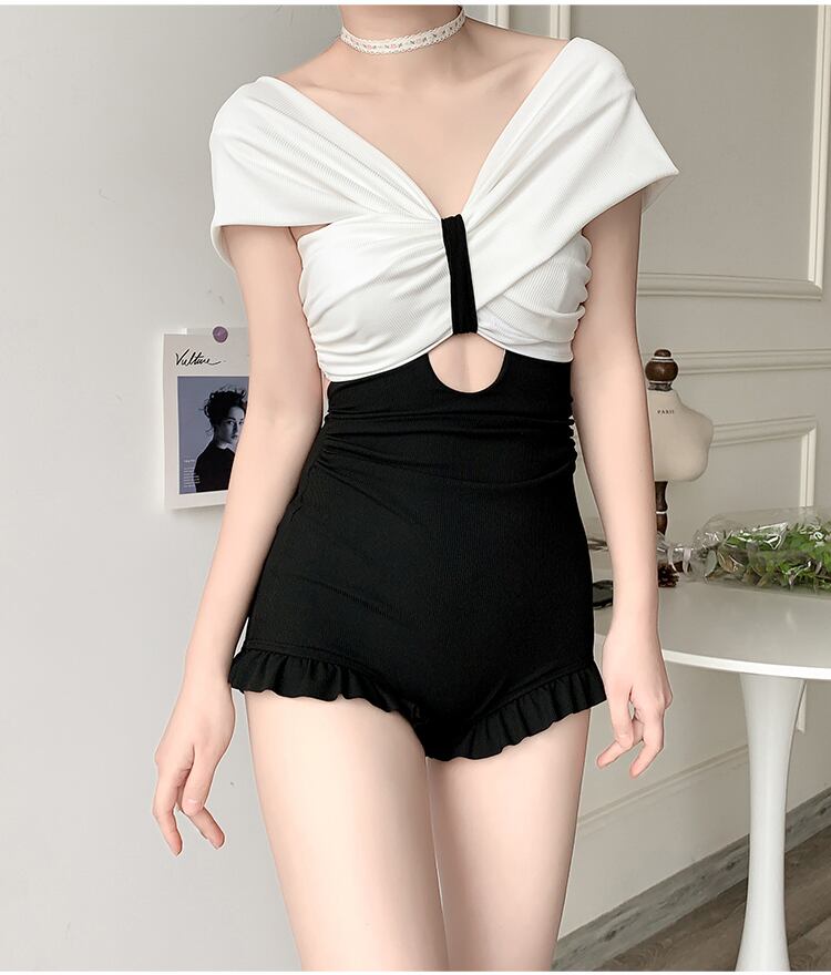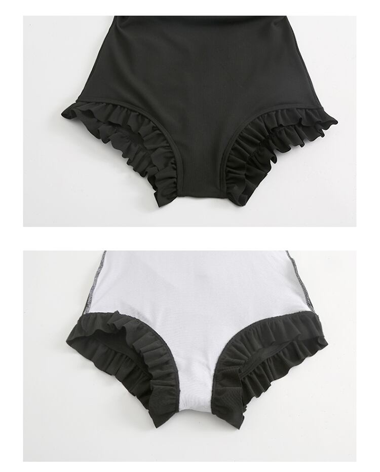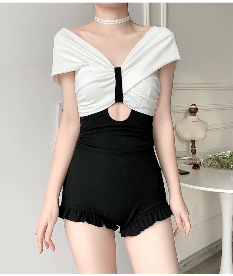 このワンピース水着は、女性らしさを引き立てるリボン&フリルの切り替えデザインが特徴。二の腕や胸元をカバーしつつ、谷間魅せでセクシーさも演出します。伸縮性のある素材で、どんな体型の方でも快適に着られるのもうれしいポイント。ビーチやプールで主役級の存在感を放ち、大人っぽい魅力を存分に発揮してください。