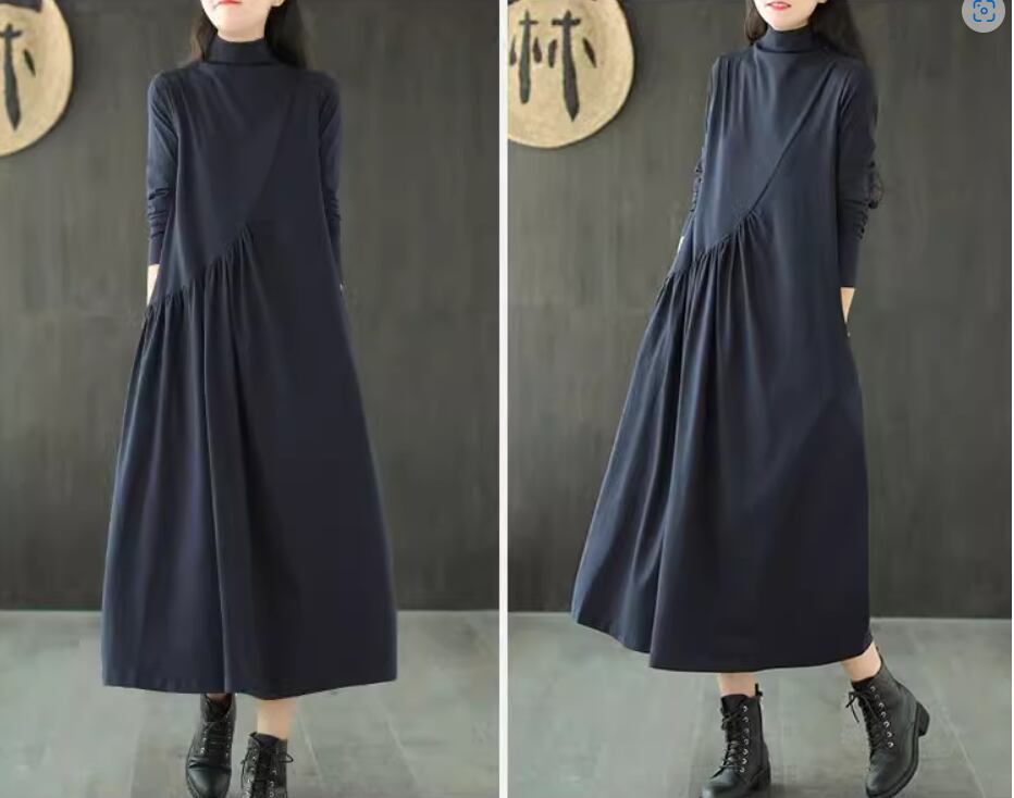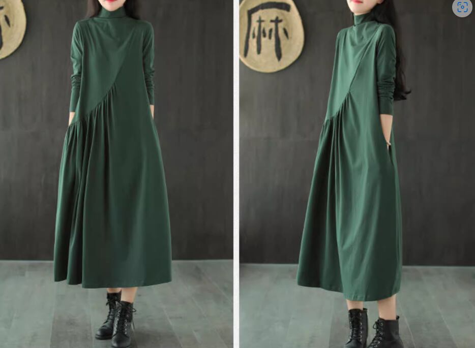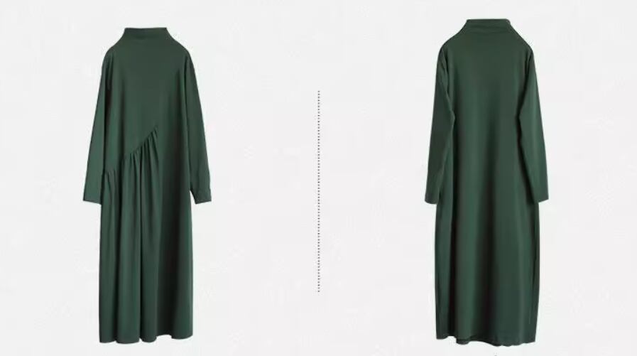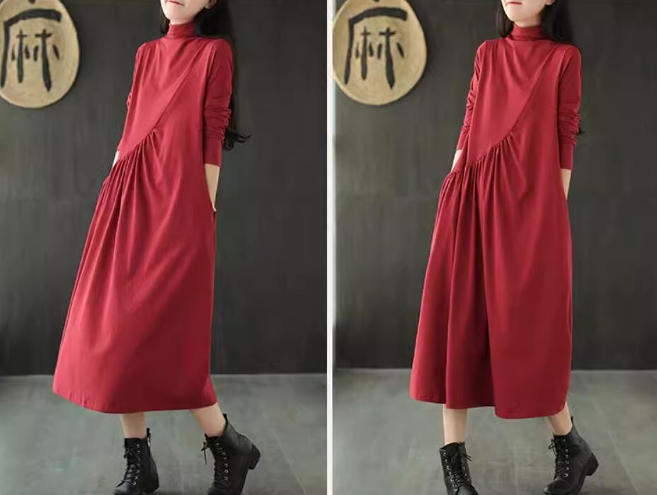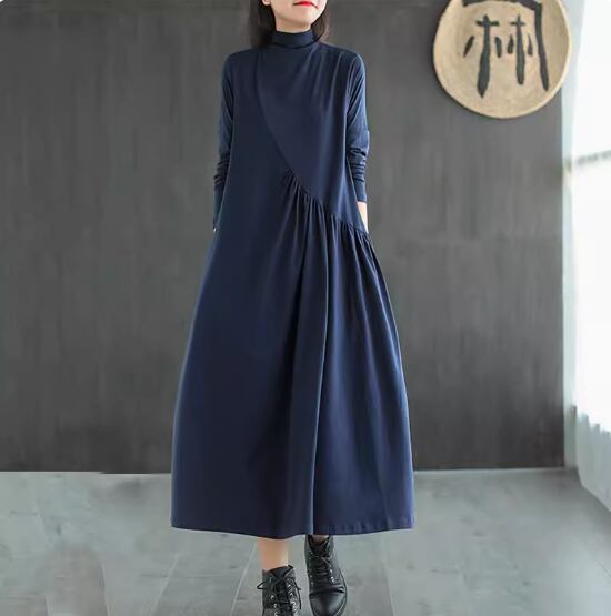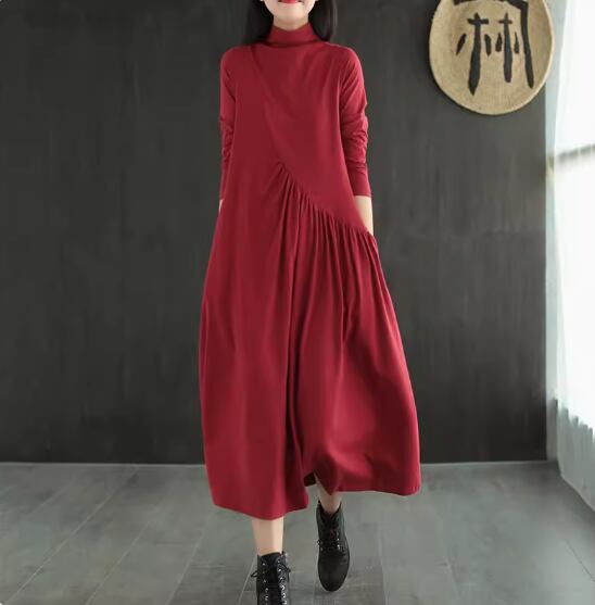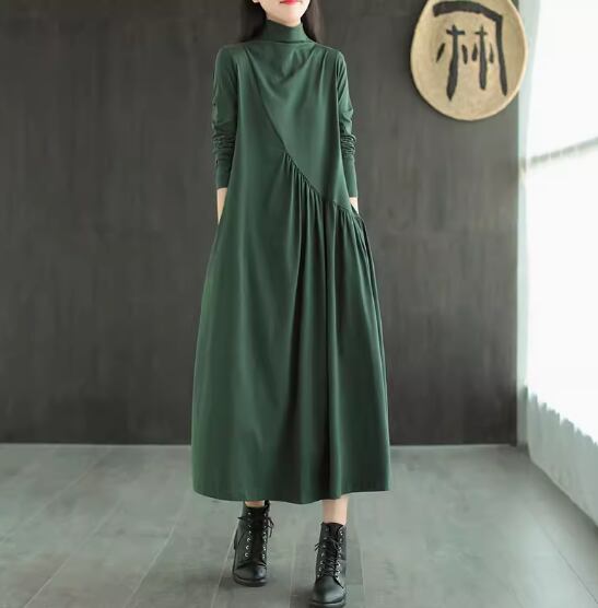 ワンピース ロング丈 袖あり 長袖 ハイネック Aライン 伸縮性 綿 かわいい シンプル カジュアル おしゃれ お洒落 無地 春 秋 冬 10代 20代 30代 40代 レディース 女性用 ママ マタニティ お出かけ 休日 着回し 楽ちん 体型カバー M L XL 2XL 黒 ブラック 赤 レッド 緑 グリーン ネイビー