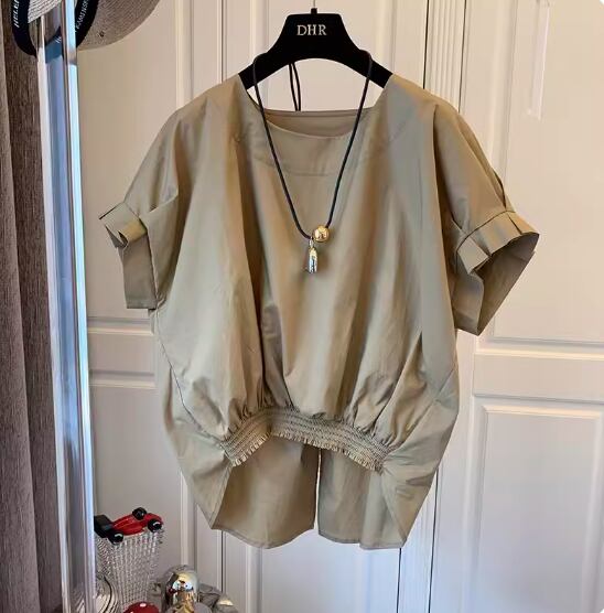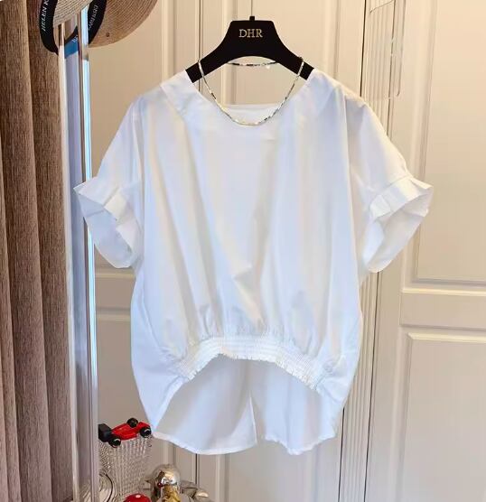 バックリボンや裾のシャーリングデザインがおしゃれな半袖ブラウス