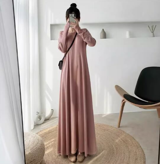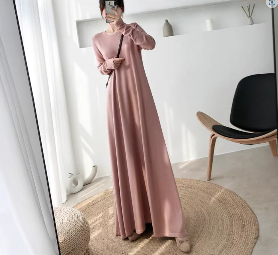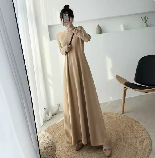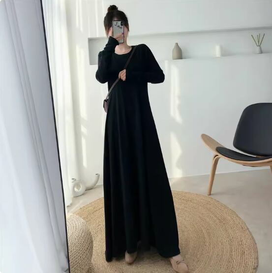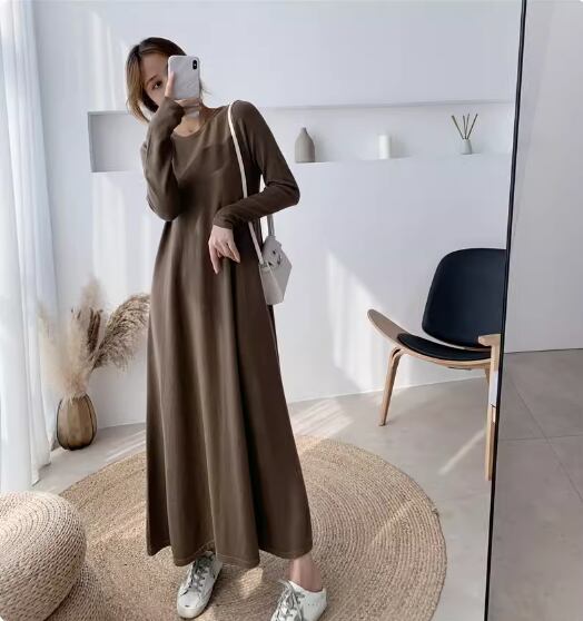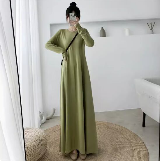 ワンピース ロング丈 袖あり 長袖 ラウンドネック Aライン 伸縮性 シンプル カジュアル 無地 春 夏 秋 10代 20代 30代 40代 レディース 女性用 ママ マタニティ お出かけ 休日 普段使い 重ね着 楽ちん M L XL 2XL 黒 ブラック 緑 グリーン 茶色 ブラウン ベージュ ピンク アプリコット