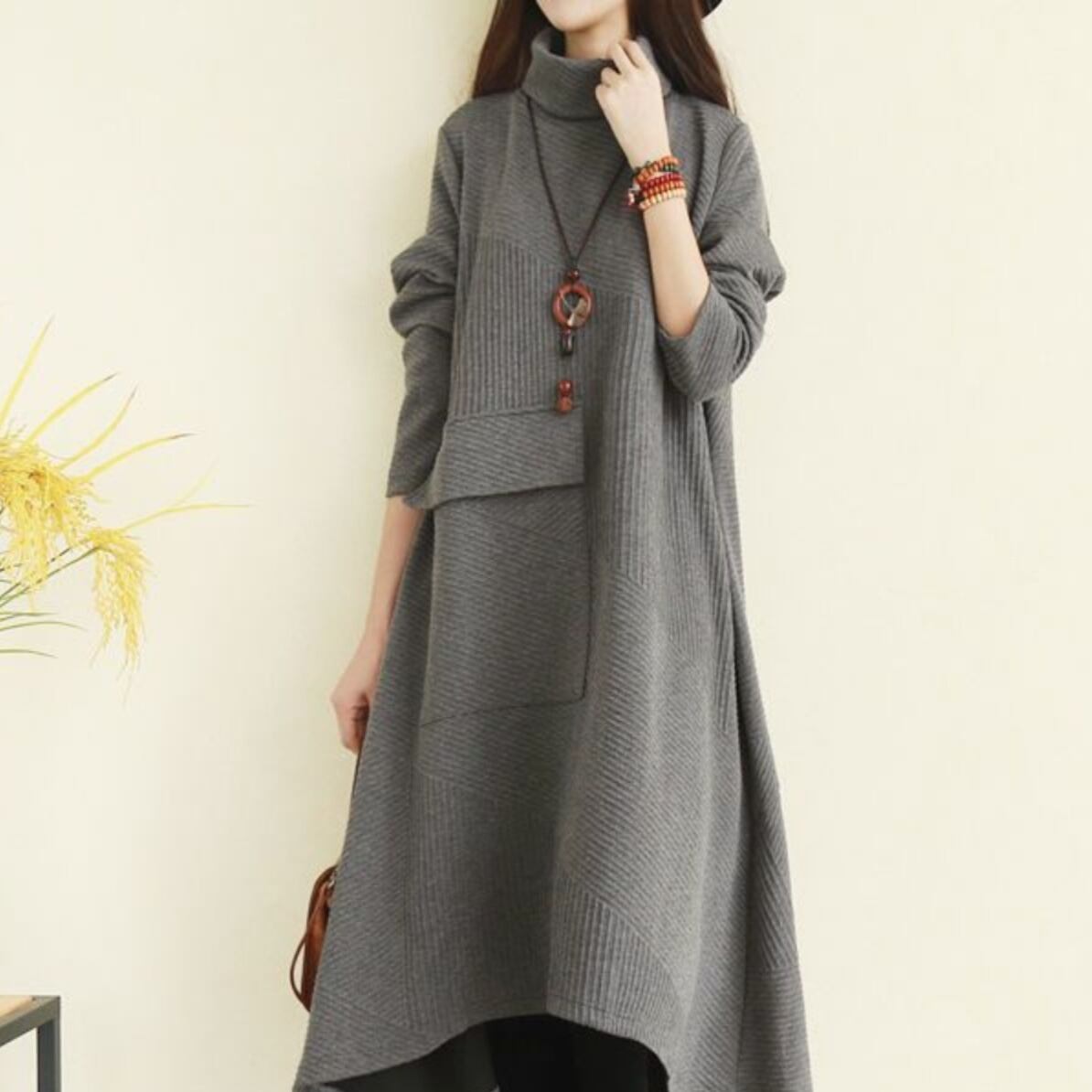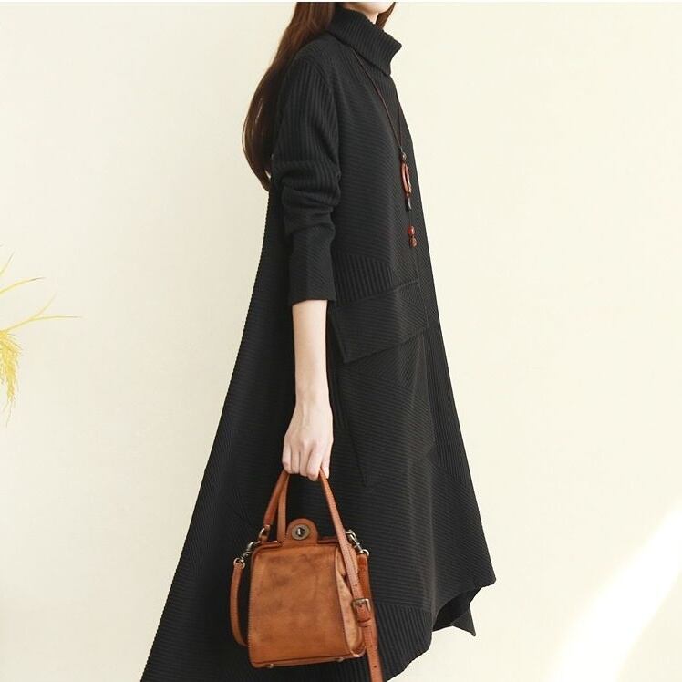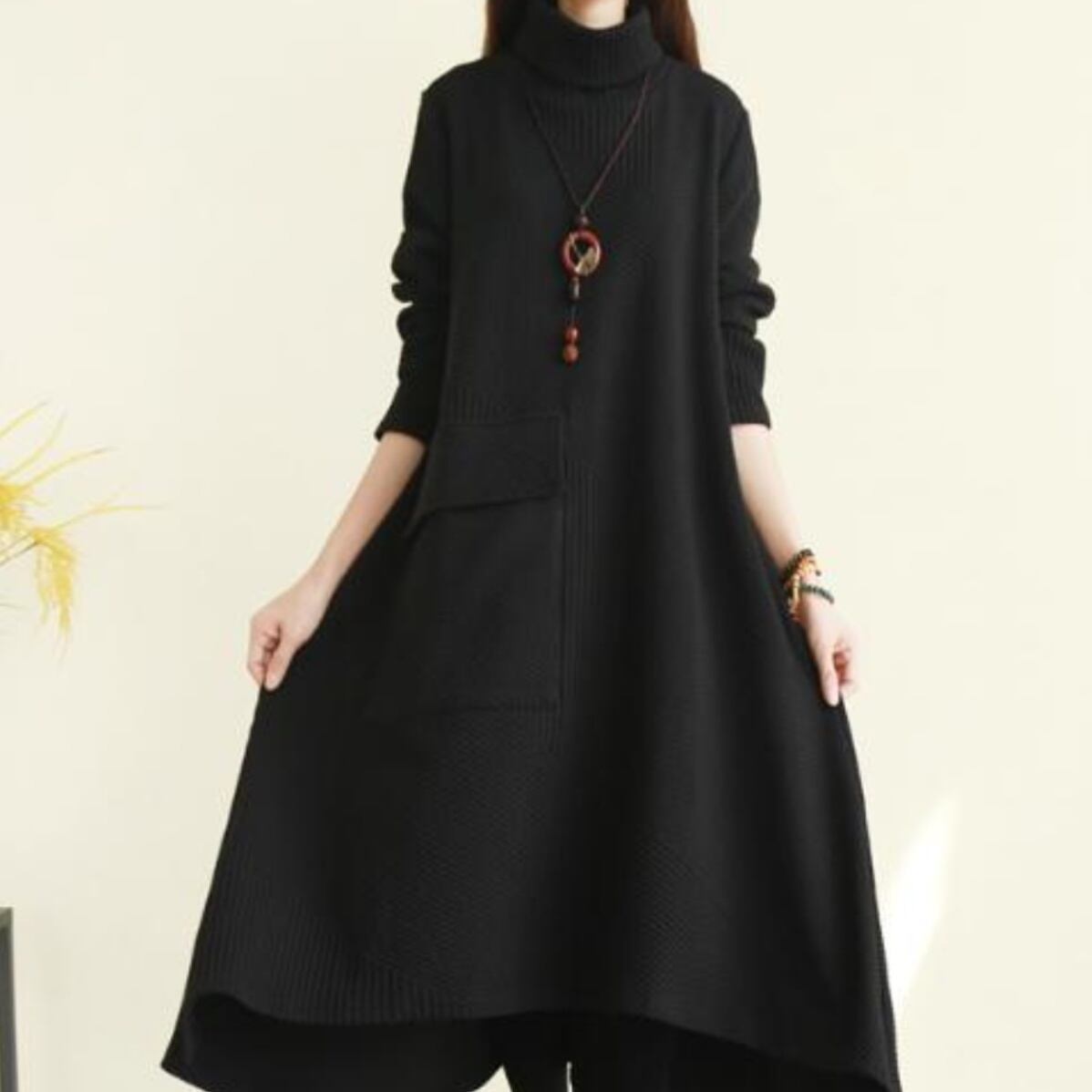 このミディアム丈ワンピースは、タートルネックとポケットが付いたシンプルでかわいいデザインが魅力です。
