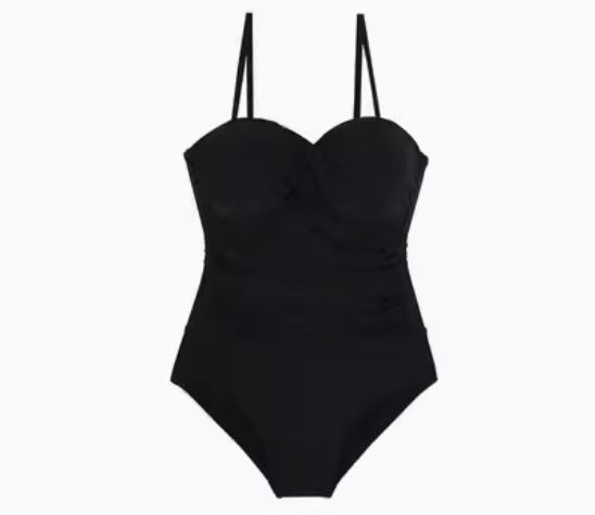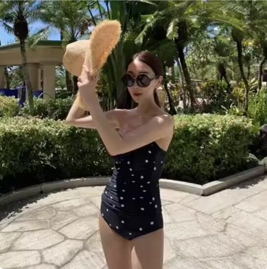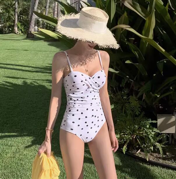 このワンピース水着は胸元のノンワイヤーデザインと、ハイウエストのお腹見せデザインが特徴的です。