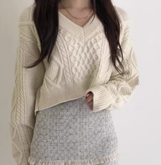 かわいさと上品さを兼ね備えたVネックニットセーター。