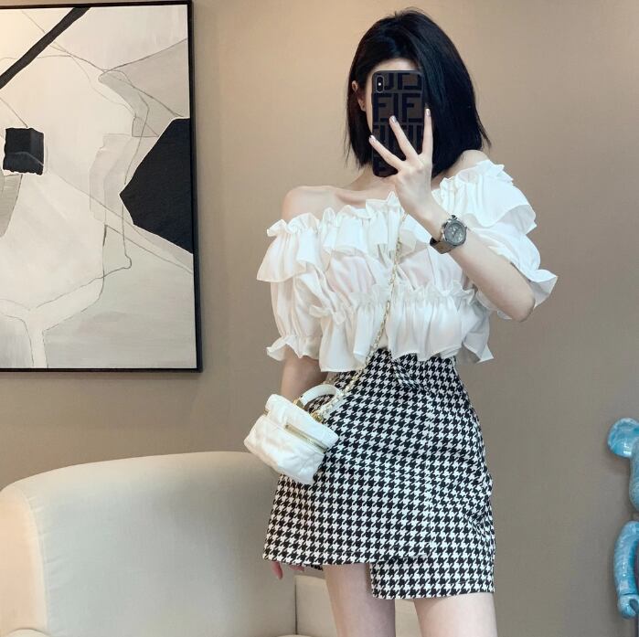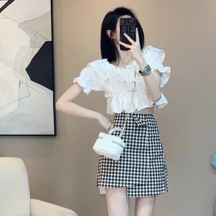 スカート トップス ブラウス セットアップ セットアイテム レディース タイトスカート ミニ ショート 5分袖 スタンドカラー フェミニン フリル ギャザー かわいい 大人可愛い おしゃれ こなれ感 ガーリー エレガント 存在感 抜け感 ラブリー キュート ロマンティック 春 秋 学生 デート お出かけ イベント 休日 合コン 脚長 S M L XL ホワイト ブラック