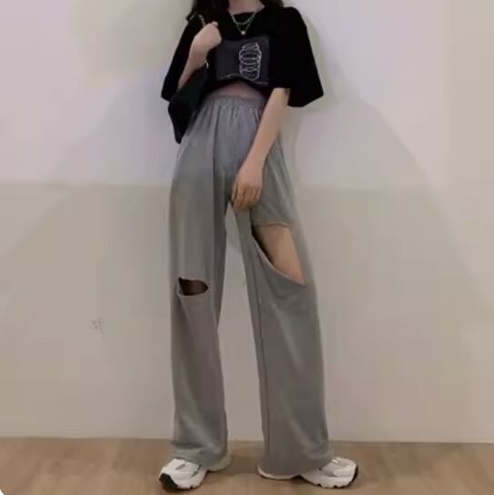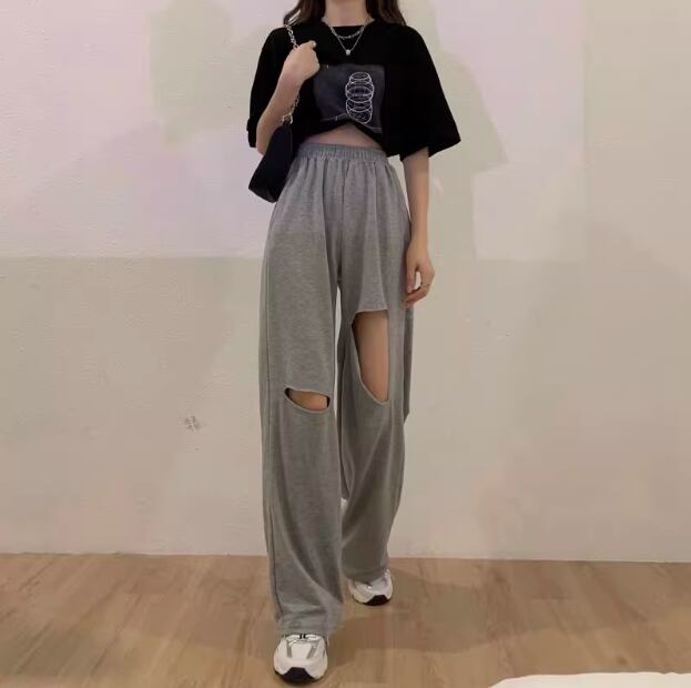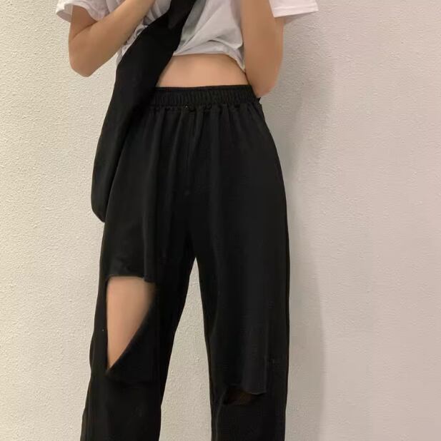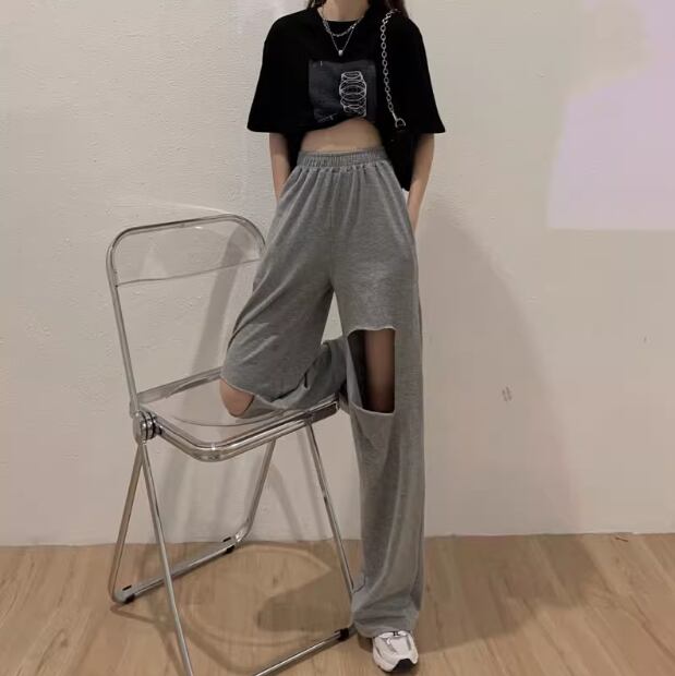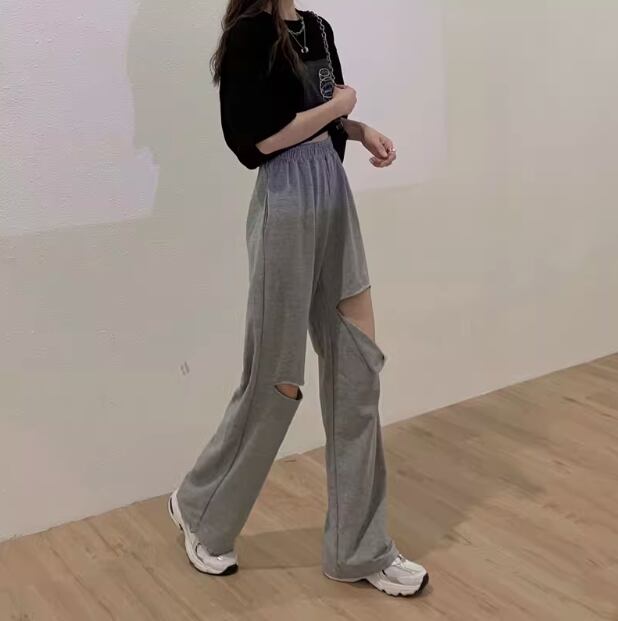ダメージ加工されたスポーティーに穿きこなせるスウェットパンツ。