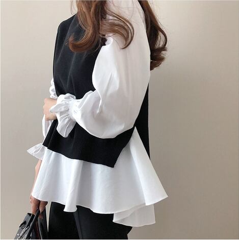 2点セット シャツ プルオーバー ミディアム丈 長袖 ラウンドネック フリル ショート丈ベスト サイドスリット かわいい 大人可愛い きれいめ シンプル カジュアル 大人 上品 おしゃれ かっこいい ベーシック クール フォーマル 大人女子 こなれ感 個性的 主役級 存在感 無地 チェック柄 オールシーズン レディース 女性用 ママ OL 通勤 オフィス ビジネス デート お出かけ 女子会 休日 アウトドア 旅行 ショッピング ホテル レイヤード 重ね着 着回し 普段使い 脚長 L XL 2XL