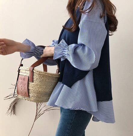 長袖のプルオーバーシャツにはフリルが施され、女性らしさを引き立てます。
