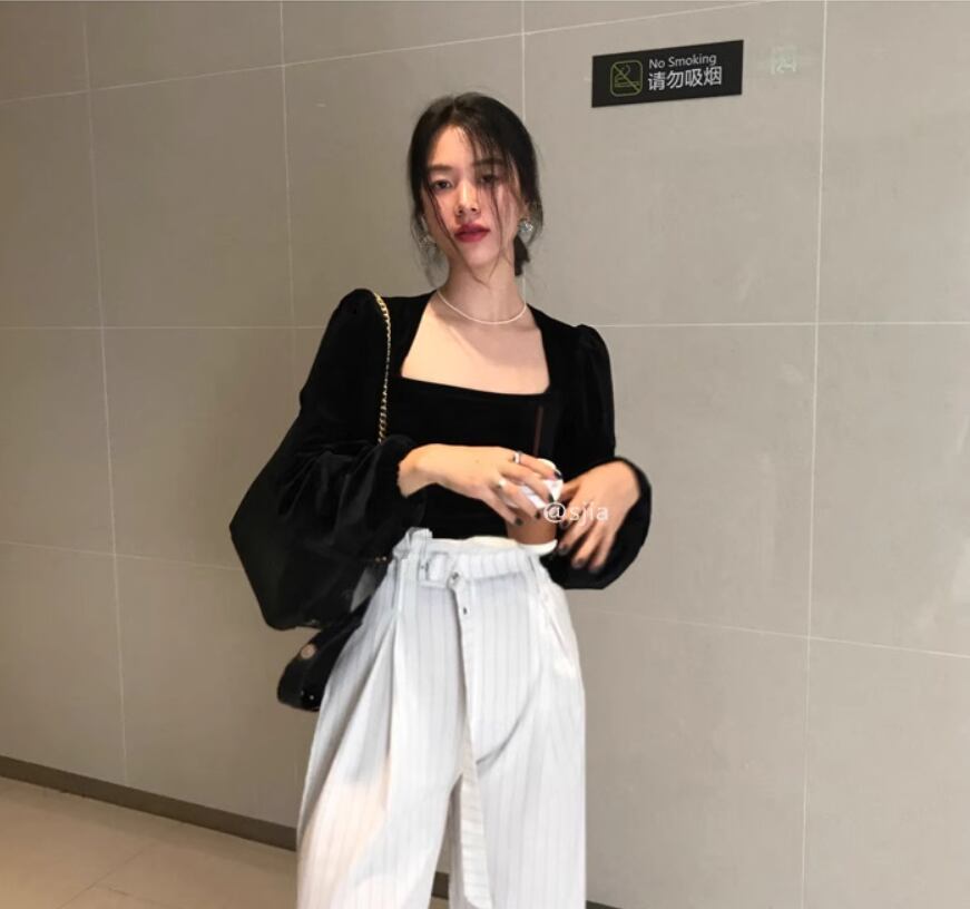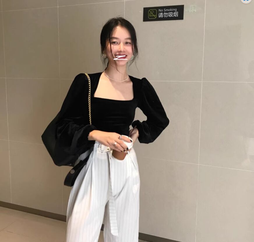 デコルテ部分が大きく開いたデザインがフェミニンなベロアトップス