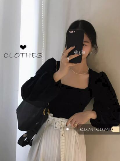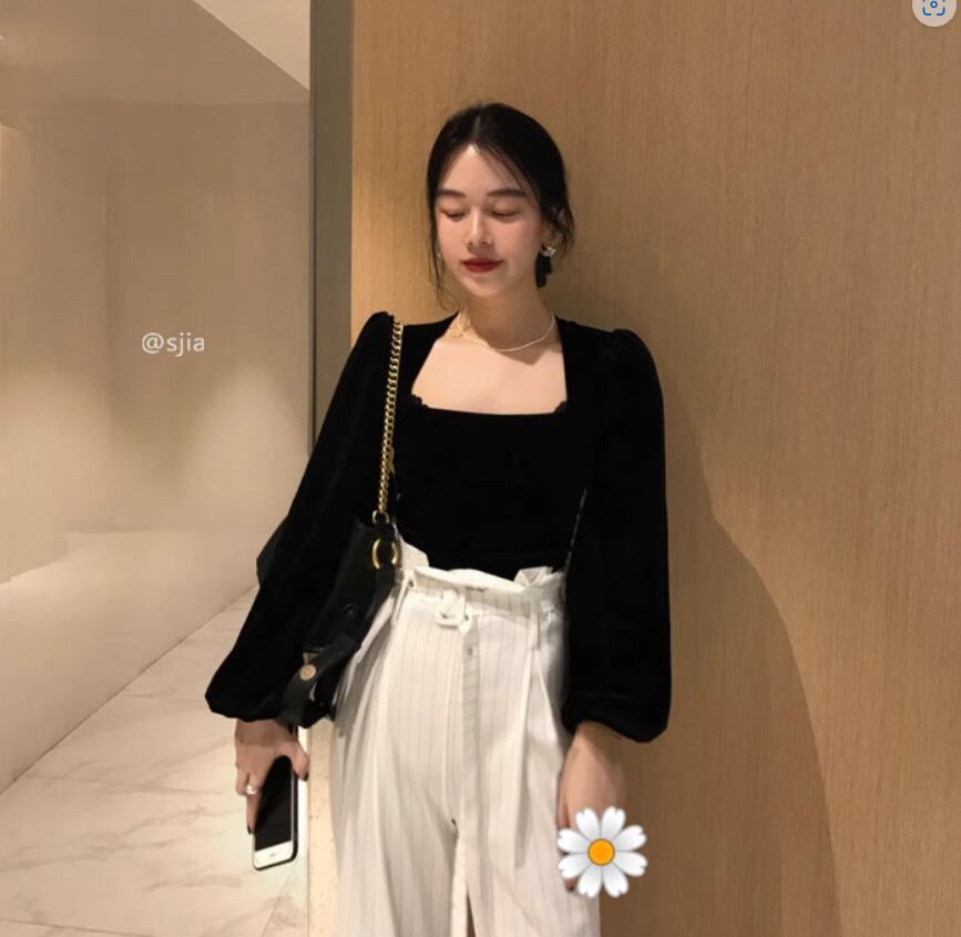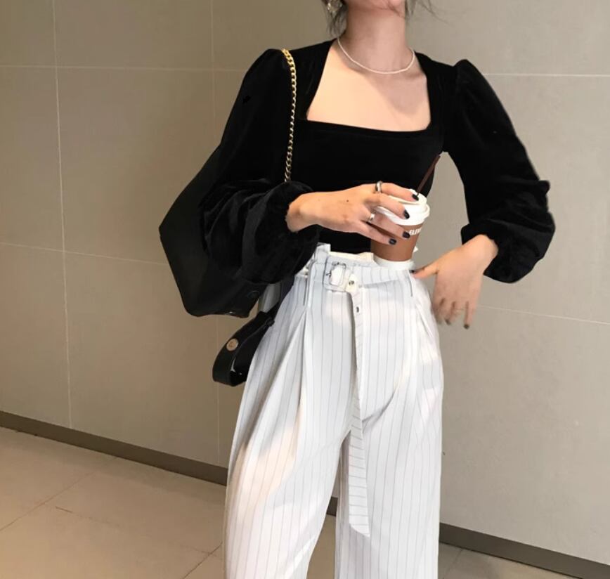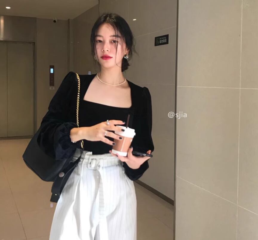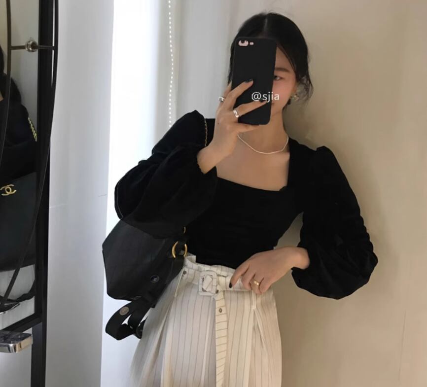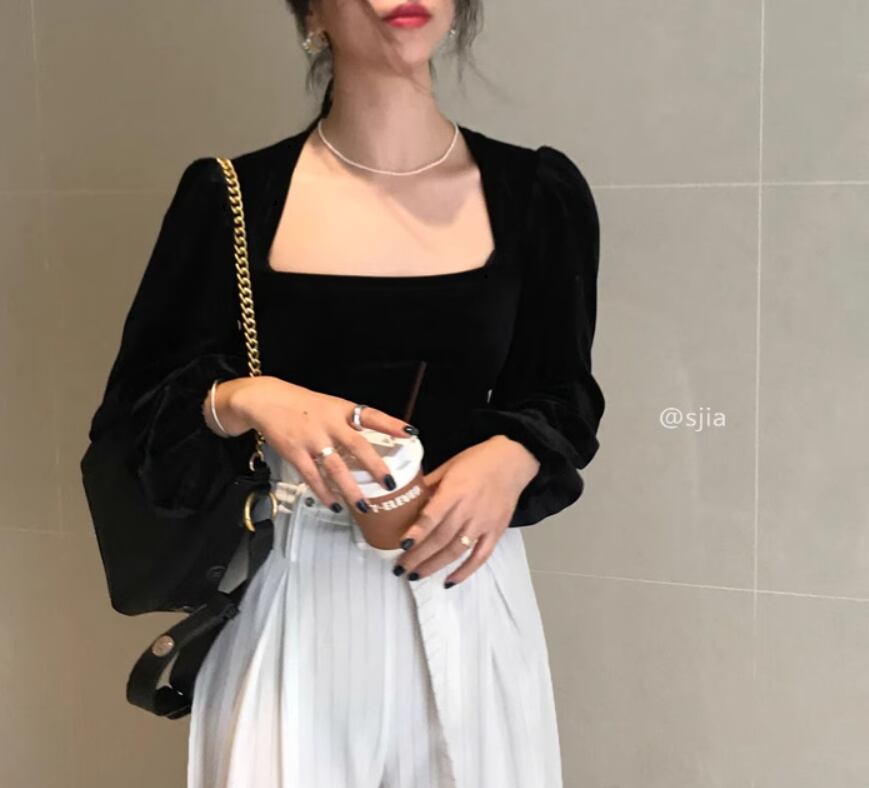 ベロアトップス カットソー 袖あり 長袖 ボリューム袖 パフスリーブ スクエアネック スリム 伸縮性 シンプル カジュアル おしゃれ お洒落 こなれ感 セクシー 存在感 とろみ感 無地 春 秋 10代 20代 30代 40代 レディース 女性用 お出かけ 休日 着回し 普段使い 楽ちん M L 黒 ブラック