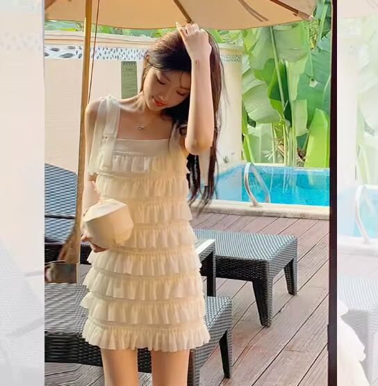 フリルデザインワンピース ミニ丈 袖なし ノースリーブ スクエアネック ストレート フリル リボン かわいい こなれ感 ラブリー キュート ガーリー 無地 夏 10代 20代 レディース 女性用 デート お出かけ 休日 リゾート 旅行 海 プール 普段使い お揃い S M L XL オフホワイト