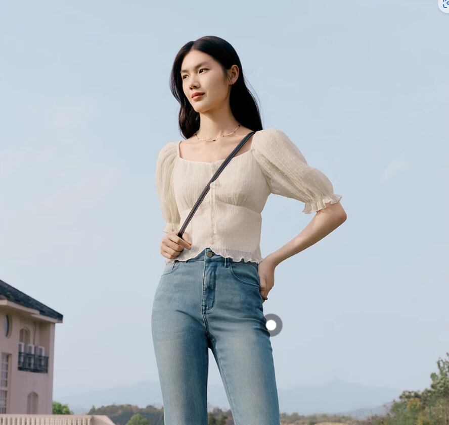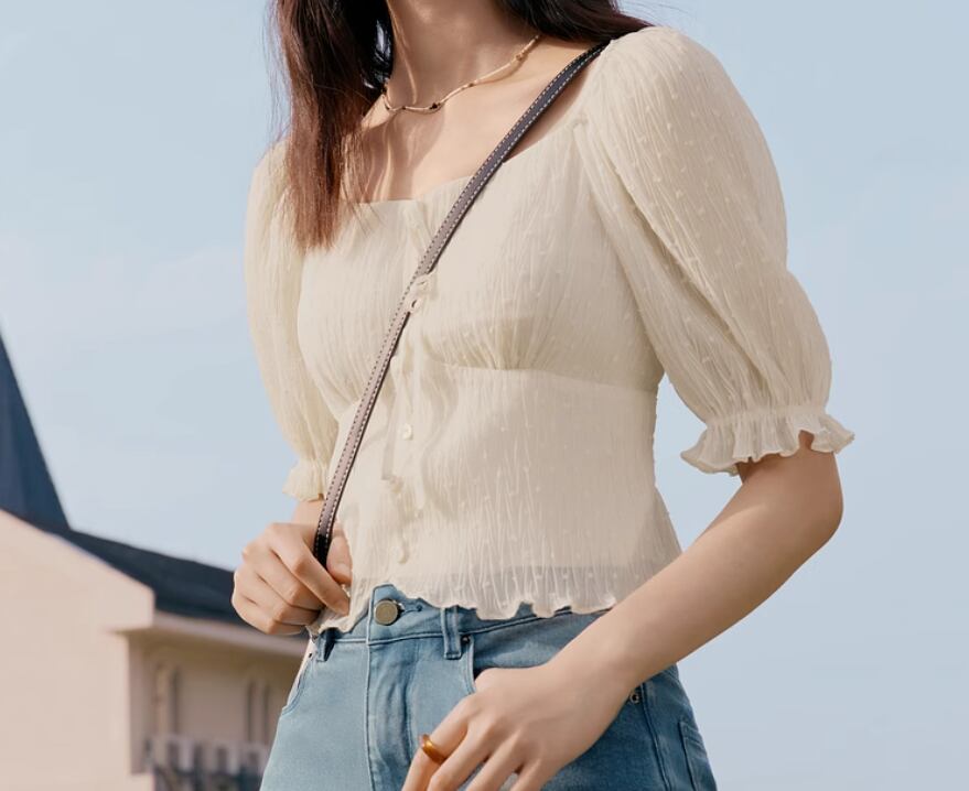 シアー素材が女性らしい雰囲気を感じさせる半袖ブラウス