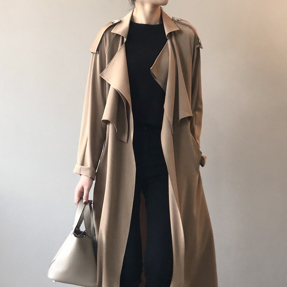 このトレンチコートは、前開きの襟付きデザインで、レトロな雰囲気とリラックス感を演出してくれます。