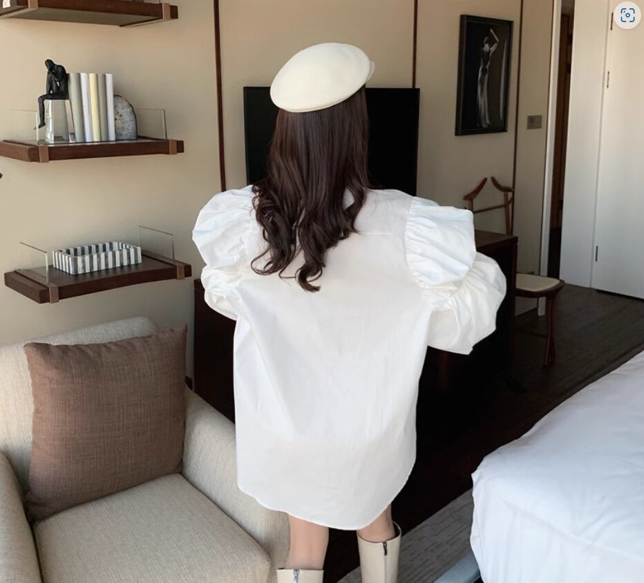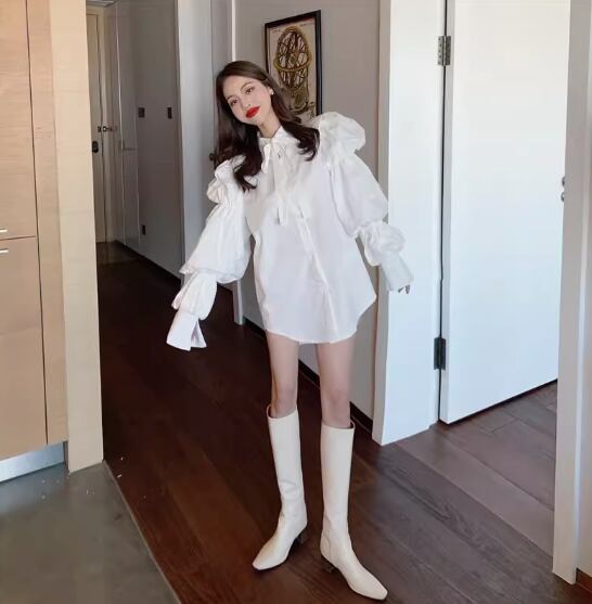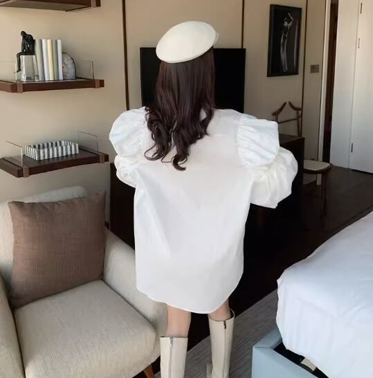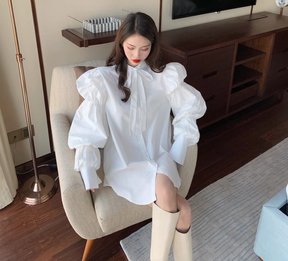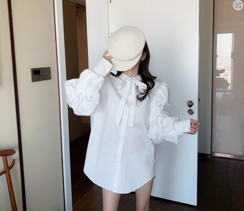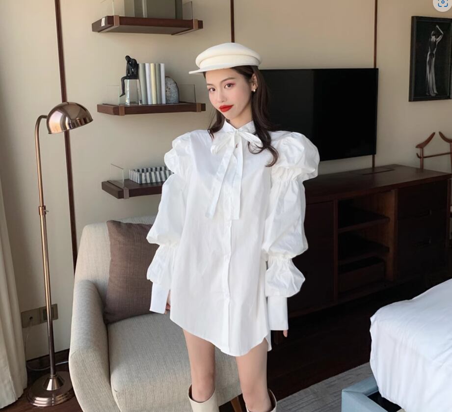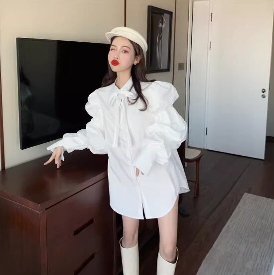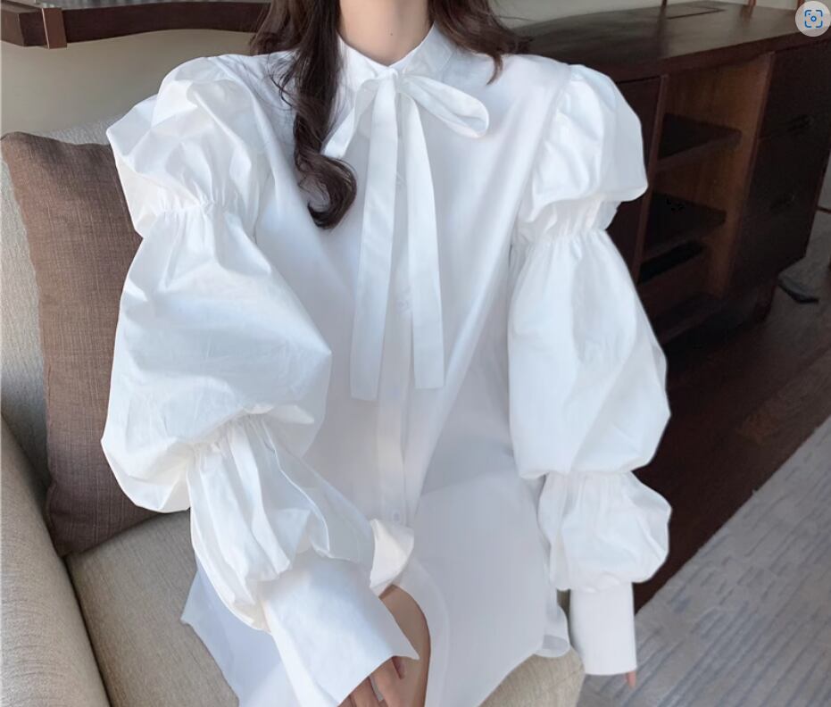 トップス シャツ ブラウス 白シャツ 白トップス ミディアム丈 袖あり 長袖 ボリューム袖 パフスリーブ 萌袖 袖コンシャス スタンドカラー ストレート ワイド リボン 透け感 綿 かわいい シンプル おしゃれ お洒落 レトロ ラブリー キュート ガーリー 個性的 存在感 無地 春 夏 10代 20代 30代 40代 レディース 女性用 ママ お出かけ 休日 着回し 普段使い S M L XL 白 ホワイト