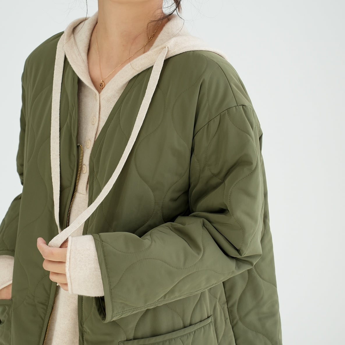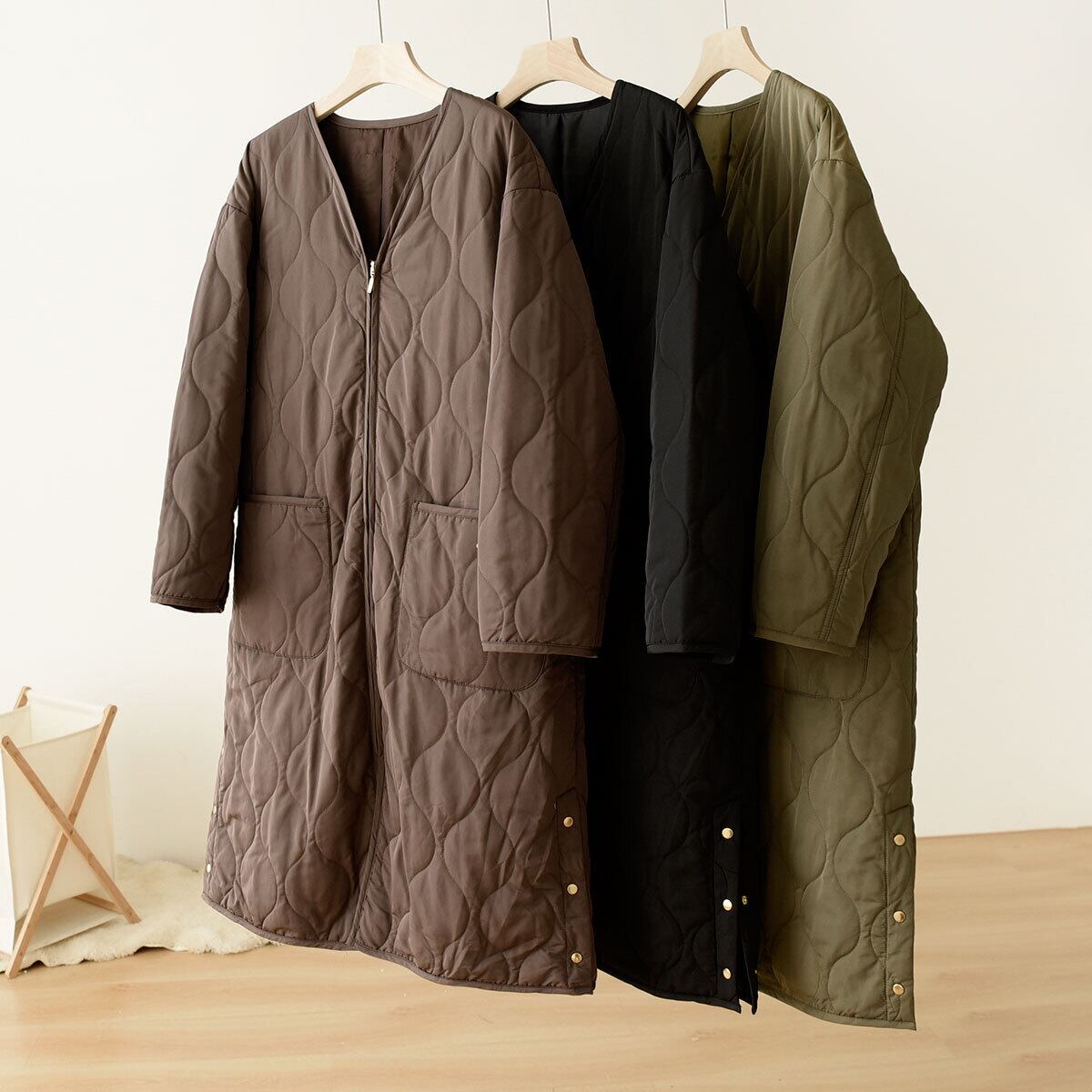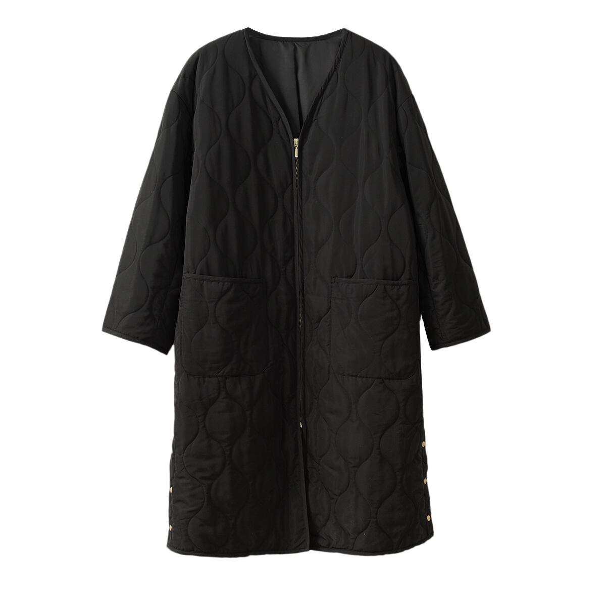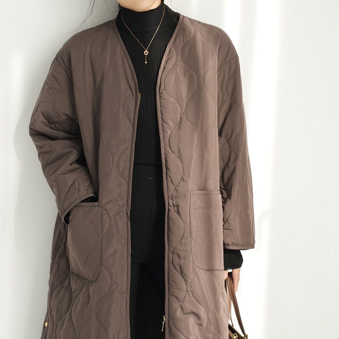 アウター ジャケット キルティングジャケット ミディアム丈 前開き 襟なし Vネック 長袖 ファスナー ポケット かわいい 大人可愛い きれいめ シンプル 上品 おしゃれ かっこいい きちんと レトロ こなれ感 個性的 主役級 存在感 抜け感 秋 冬 ナチュラル ベーシック クール 無地 レディース 女性用 ママ マタニティ OL 通勤 ビジネス 学生 通学 デート お出かけ お泊まり イベント 女子会 休日 カフェ ショッピング 旅行 レストラン コンパ 重ね着 普段使い 着回し ワンサイズ 暖かい