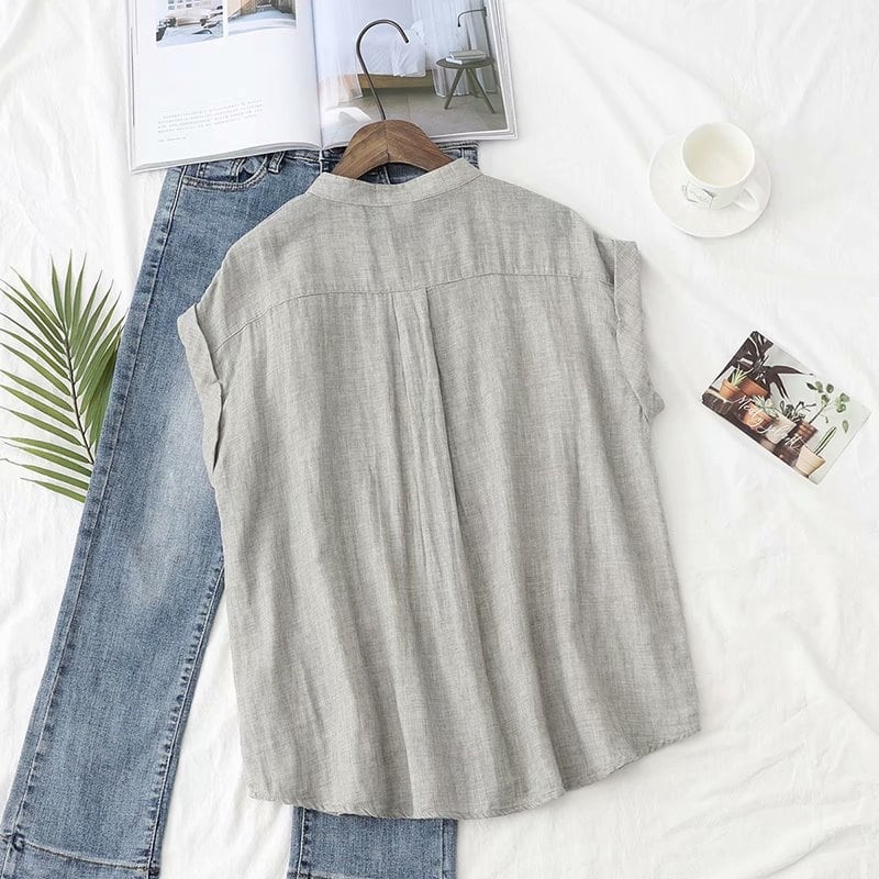 トップス シャツ ミディアム丈 半袖 襟なし Vネック 前開き ボタン 薄手 かわいい 大人可愛い きれいめ シンプル 上品 おしゃれ かっこいい レトロ こなれ感 きちんと 個性的 主役級 存在感 抜け感 ラフ 春 夏 キュート ナチュラル ベーシック メンズライク エレガント レディース 女性用 ママ OL 通勤 オフィス ビジネス 学生 通学 デート お出かけ お泊まり イベント 女子会 休日 アウトドア カフェ ショッピング レストラン コンパ レイヤード 重ね着 普段使い 着回し M L