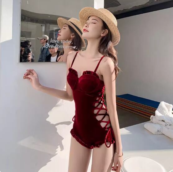 水着 スイムウェア ワンピース水着 フリル レースアップ 大人可愛い セクシー シンプル ゴージャス 華やか 大人っぽい おしゃれ お洒落 レトロ 女っぽ 個性的 無地 10代 20代 30代 レディース 女性用 海 ビーチ プール M L XL 黒 ブラック ブルゴーニュ