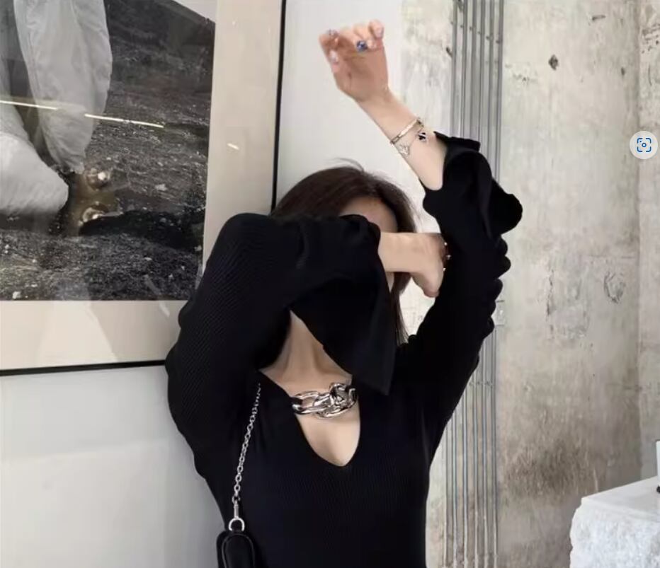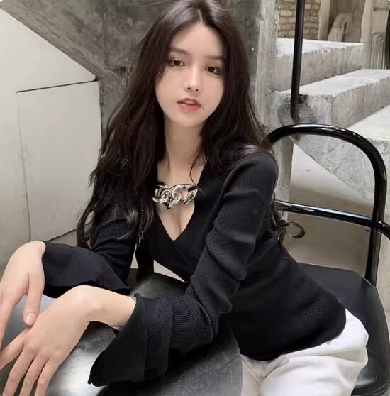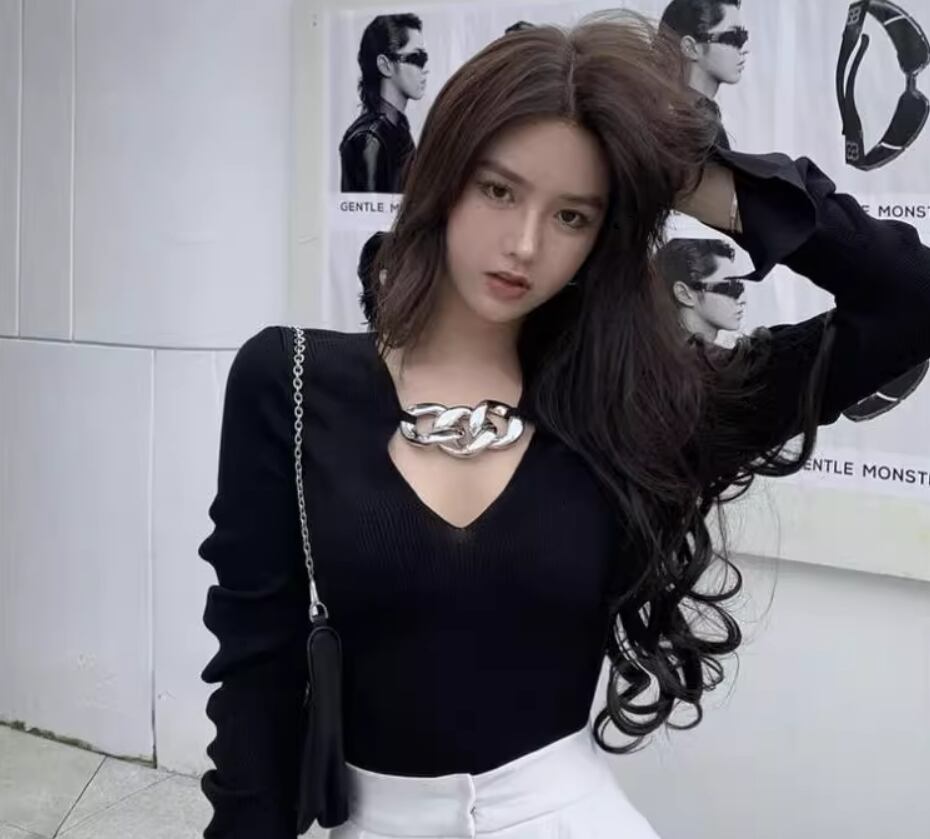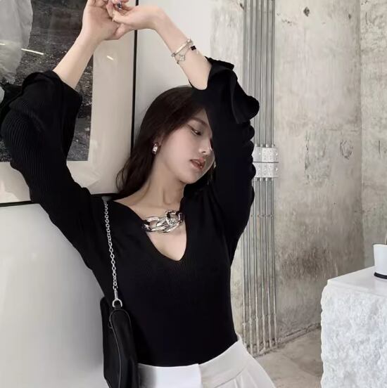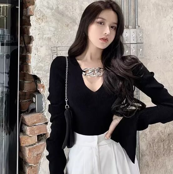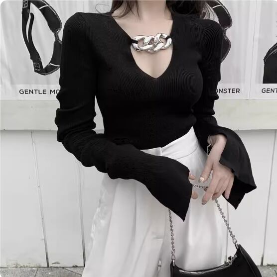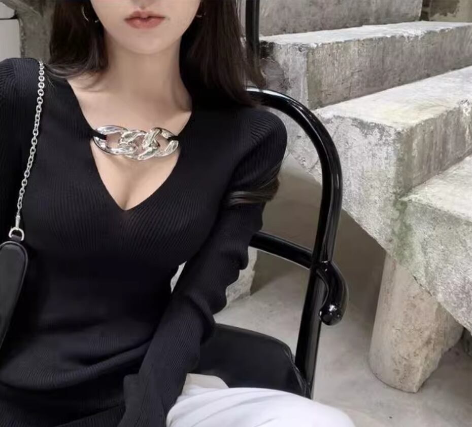 大きめチェーン付きニット トップス ニットソー 袖あり 長袖 萌袖 Vネック ストレート 伸縮性 綿 ポリエステル きれいめ おしゃれ お洒落 かっこいい こなれ感 個性的 存在感 無地 春 秋 10代 20代 30代 レディース 女性用 お出かけ 休日 着回し 普段使い 楽ちん フリーサイズ 黒 ブラック