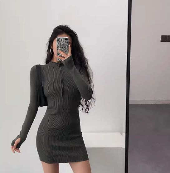 ワンピース ミニ丈 袖あり 長袖 ハイネック スリム タイト 細身 伸縮性 シンプル カジュアル おしゃれ お洒落 こなれ感 セクシー 無地 春 秋 10代 20代 レディース 女性用 お出かけ イベント 旅行 普段使い お揃い 双子 スタイル S M 黒 ブラック 青 ブルー 灰色 グレー カーキ ライトブルー