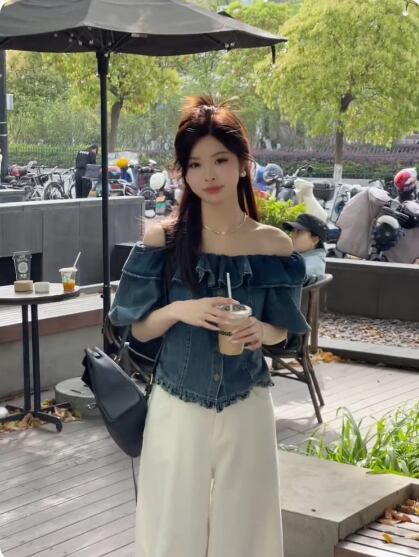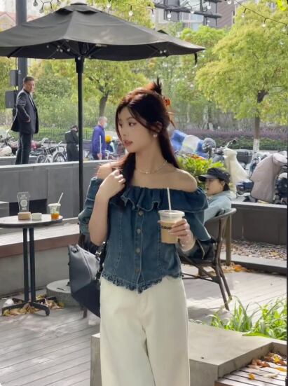 フリルが可愛いオフショルデニムトップス