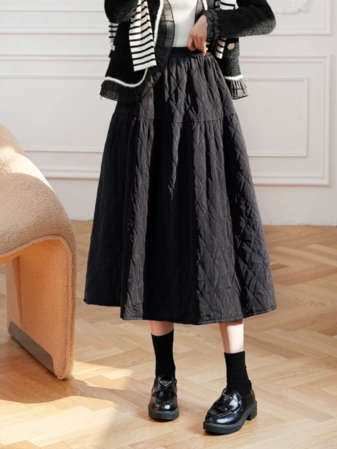 中綿スカートが登場いたしました!このスカートは、膝下丈で暖かく、風を通さないキルティングデザインが特徴です。撥水加工も施しておりますので、急な雨でも安心◎
