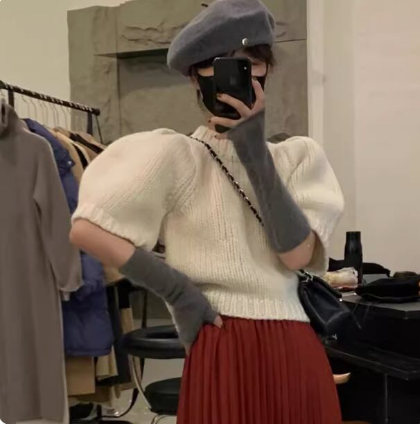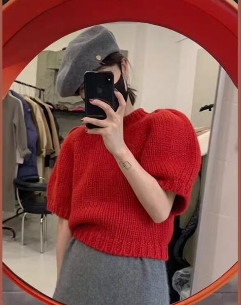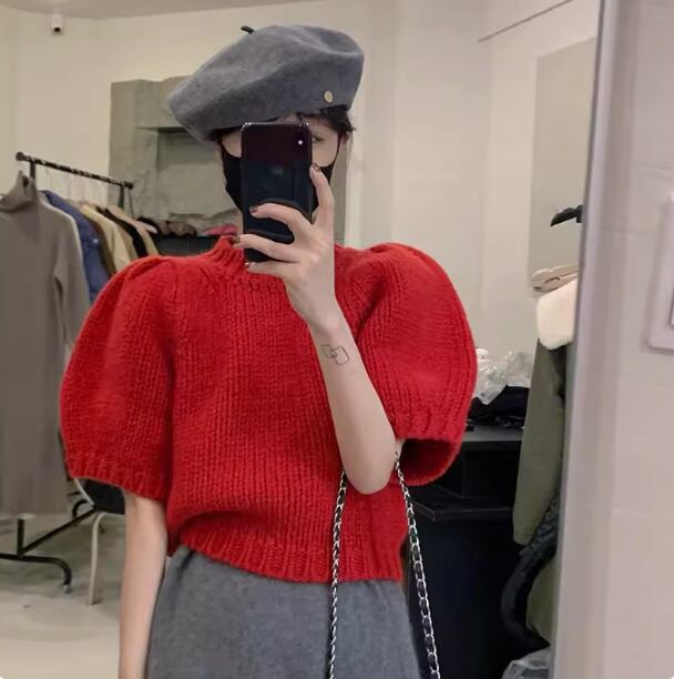 レディース トップス ニットソー ショート丈 半袖 パフスリーブ 袖あり ラウンドネック 襟なし かわいい 大人可愛い シンプル カジュアル おしゃれ レトロ キュート 夏 秋 女性用 10代 20代 デート お出かけ リゾート 旅行 海 レストラン ビーチ 公園 女子会 休日 バカンス ショッピング カフェ 普段使い 着回し モテ S M L XL 2XL レッド ブラック ホワイト