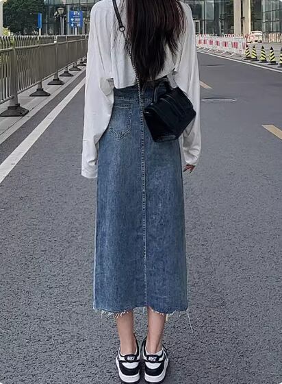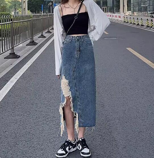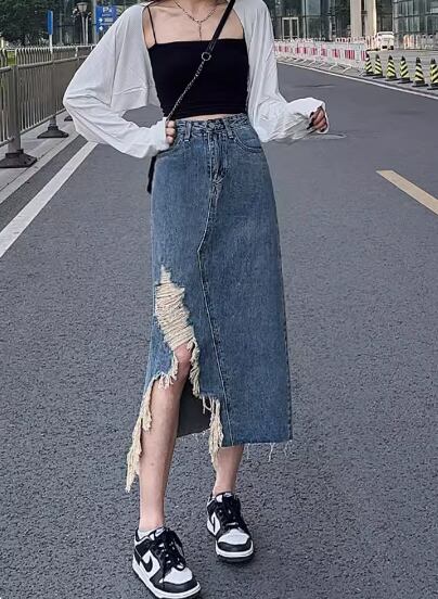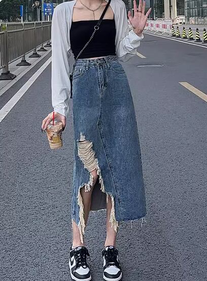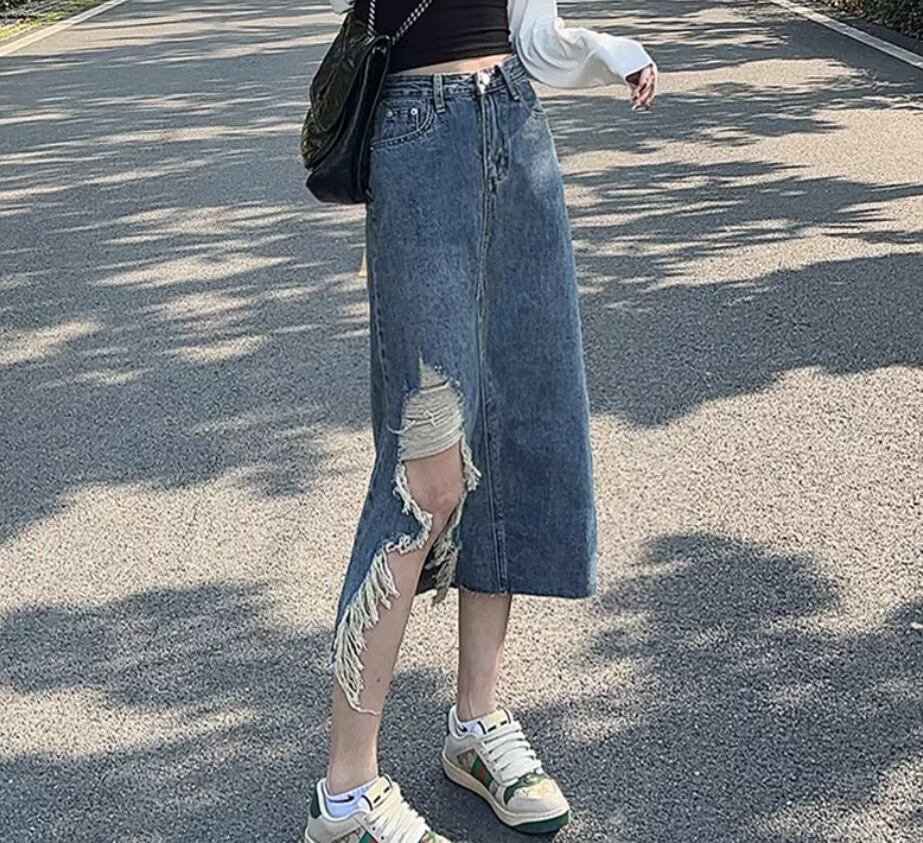 ダメージ加工デニムスカート スカート ボトムス デニムスカート ミモレ丈 ミディアム丈 Aライン ハイウエスト デニム ブルーデニム シンプル カジュアル おしゃれ お洒落 かっこいい こなれ感 無地 春 夏 秋 10代 20代 30代 レディース 女性用 お出かけ 休日 イベント 着回し 普段使い ダメージ 穴あき XS S M L XL 2XL 青 ブルー