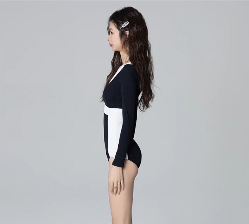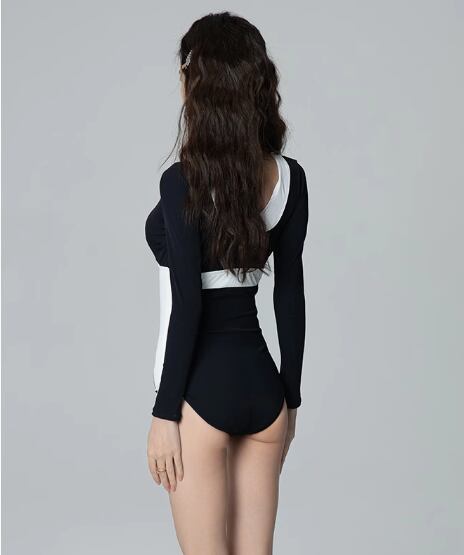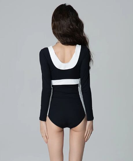 バイカラーワンピース水着 長袖 切り替えデザイン かわいい 大人可愛い シンプル カジュアル 大人 大人っぽい おしゃれ お洒落 無地 10代 20代 30代 40代 レディース 女性用 ママ 夏 海 ビーチ プール リゾート 旅行 M L XL 黒 ブラック バイカラー