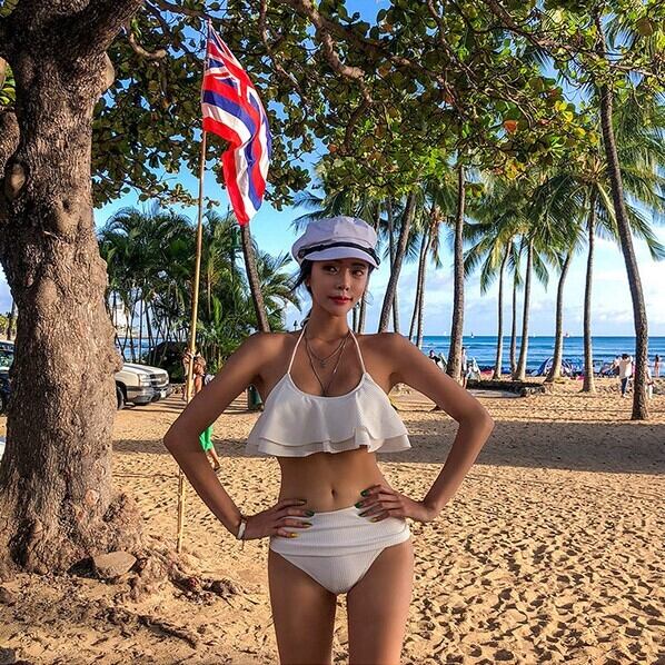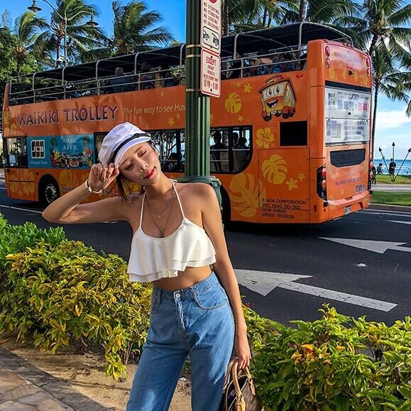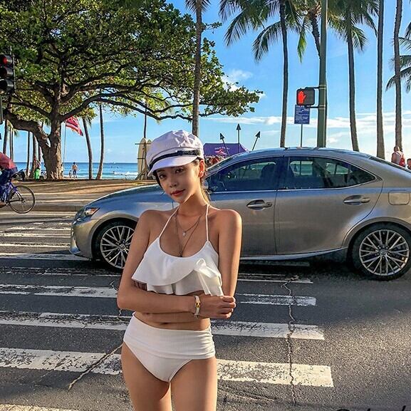 胸元のフレアデザインが可愛いバンドゥホルターネック。バストにフィットするパッド付きのトップは、女性らしさを引き立ててくれます。清潔感溢れるホワイトで、夏の陽光の下で輝くこと間違いなし。