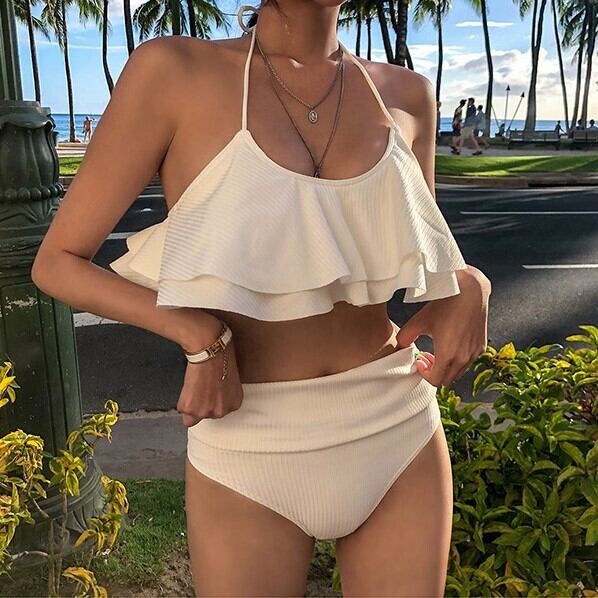 水着 ビキニ レディース バンドゥ ホルターネック パッド付き ハイウエスト フレア かわいい 大人可愛い きれいめ シンプル カジュアル ナチュラル ゴージャス 華やか 大人っぽい おしゃれ お洒落 ラブリー キュート ガーリー セクシー トレンド 無地 リゾート プール 夏 海 脚長 スタイルアップ 韓国 モテ インスタ映え こなれ感 M L XL ホワイト