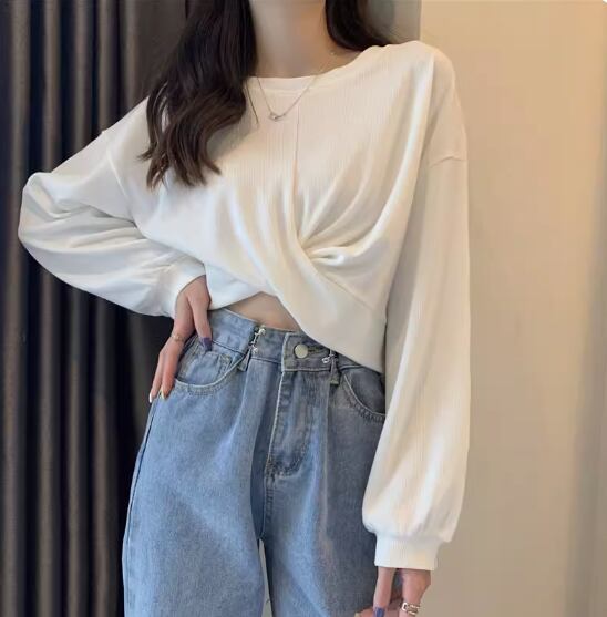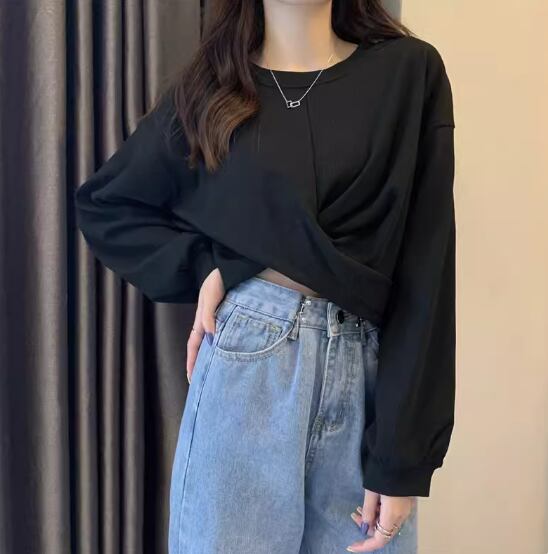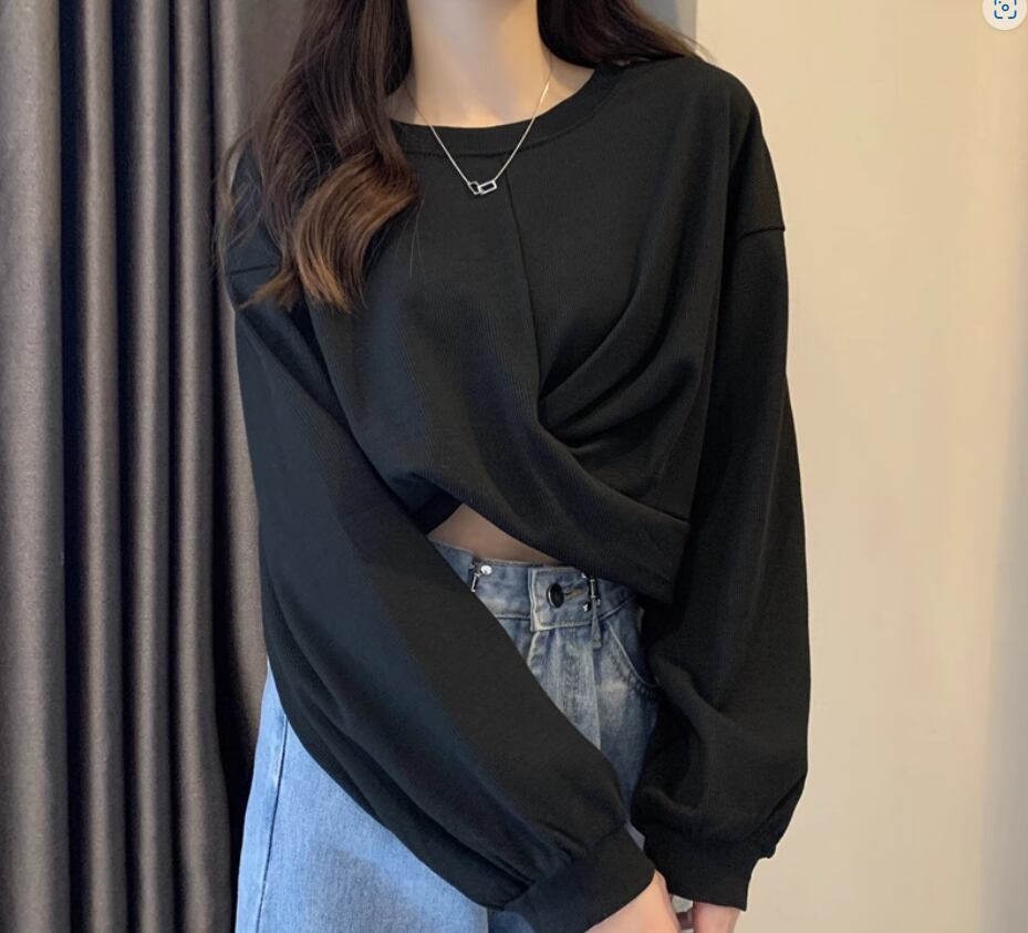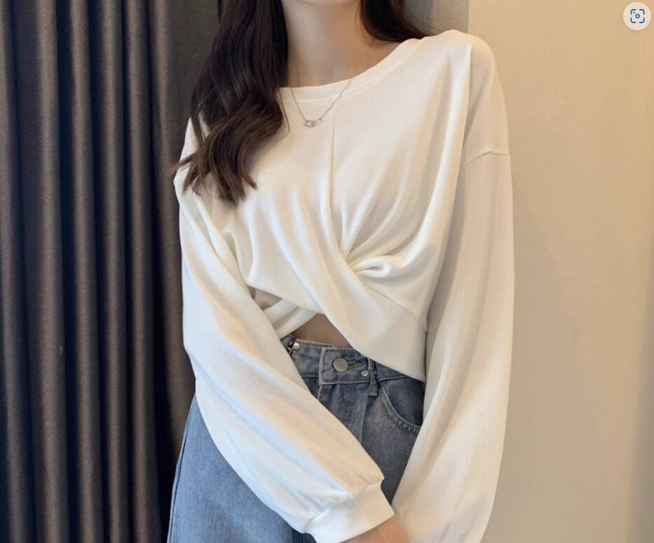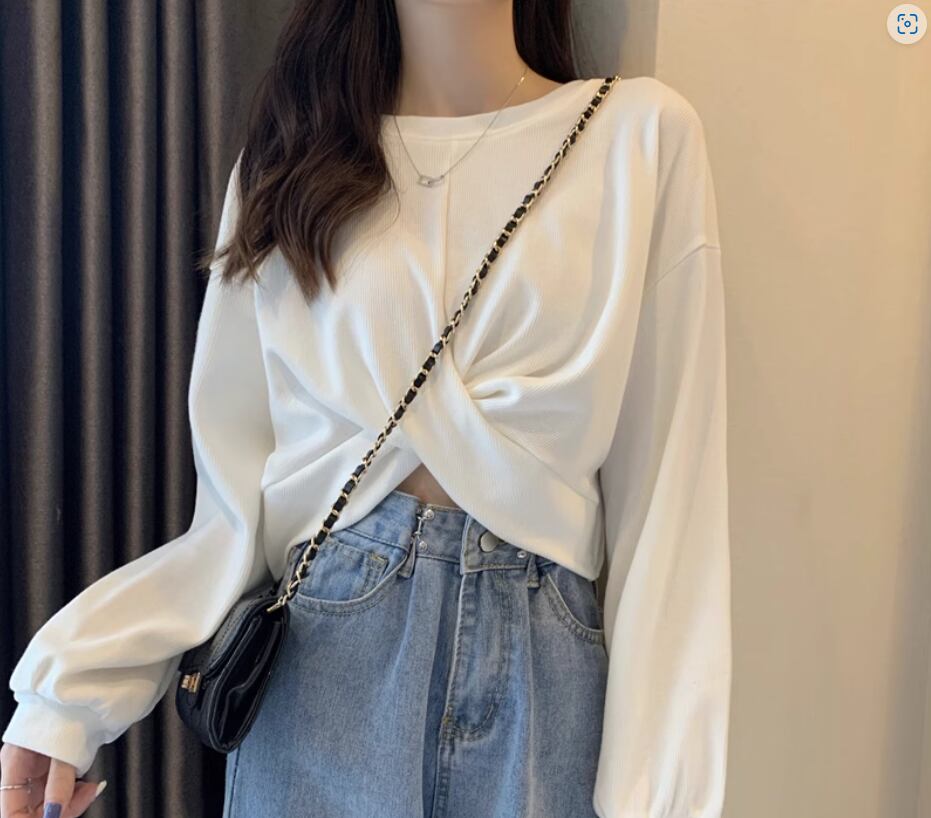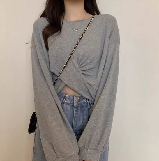 裾クロスデザイントップス プルオーバー 白トップス ショート丈 袖あり 長袖 ボリューム袖 ラウンドネック 伸縮性 シンプル カジュアル おしゃれ お洒落 かっこいい こなれ感 スポーティー 個性的 セクシー 存在感 春 夏 10代 20代 レディース 女性用 お出かけ 休日 リゾート 旅行 海 プール 着回し 普段使い スタイル 楽ちん フリーサイズ 白 ホワイト 黒 ブラック 茶色 ブラウン 灰色 グレー