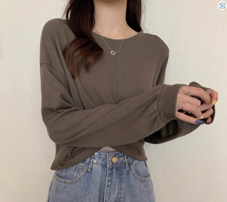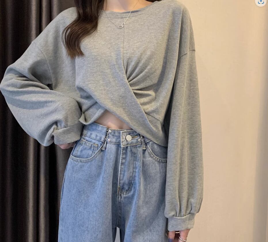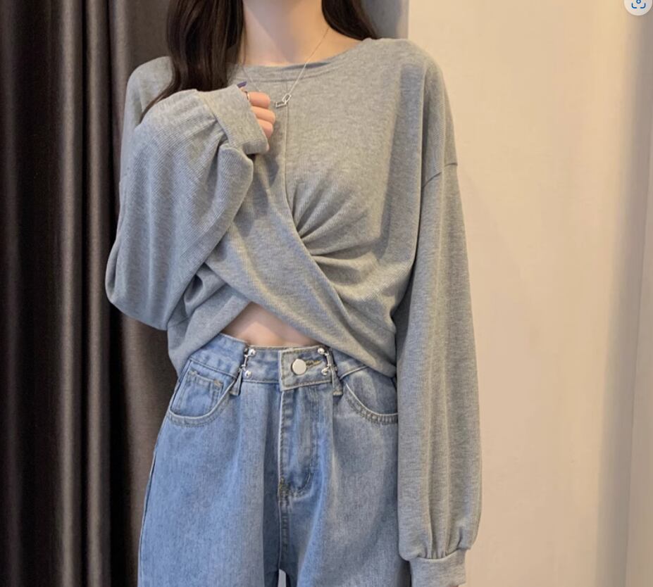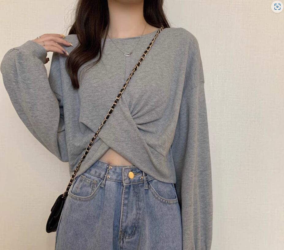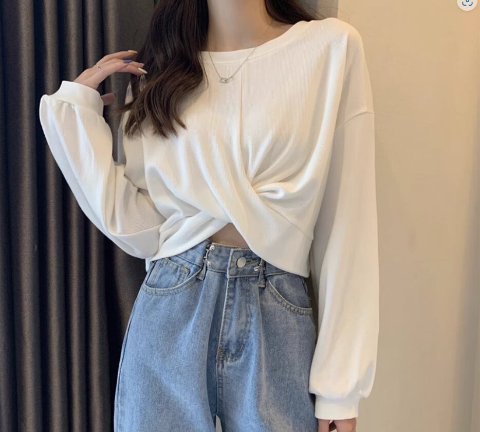 裾クロスデザイントップス プルオーバー 白トップス ショート丈 袖あり 長袖 ボリューム袖 ラウンドネック 伸縮性 シンプル カジュアル おしゃれ お洒落 かっこいい こなれ感 スポーティー 個性的 セクシー 存在感 春 夏 10代 20代 レディース 女性用 お出かけ 休日 リゾート 旅行 海 プール 着回し 普段使い スタイル 楽ちん フリーサイズ 白 ホワイト 黒 ブラック 茶色 ブラウン 灰色 グレー