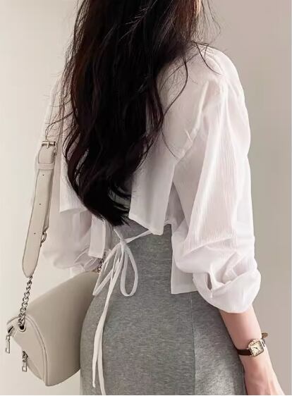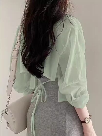 トップス シャツ ブラウス 白シャツ 白トップス ショート丈 袖あり 長袖 襟付き シフォン バックリボン バックコンシャス 透け感 かわいい 大人可愛い シンプル カジュアル おしゃれ お洒落 大人女子 こなれ感 個性的 無地 夏 10代 20代 30代 レディース 女性用 ママ デート お出かけ 休日 リゾート 旅行 海 プール 着回し 普段使い 重ね着 楽ちん S M L XL 白 ホワイト 緑 グリーン