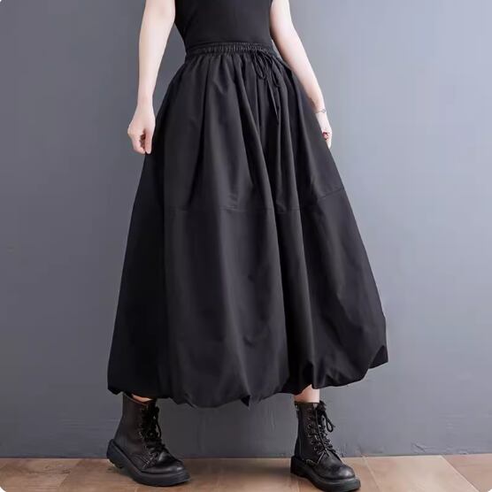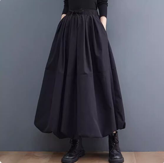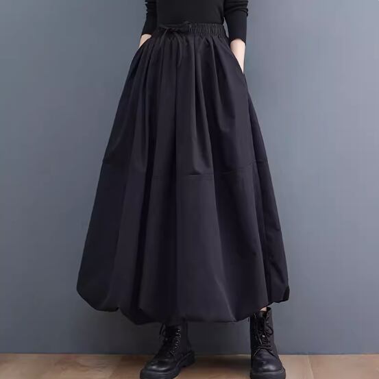 フレアスカート レディース スカート ロングスカート ロング丈 体型カバー 大人 きれいめバルーンスカート ウエストゴム ふっくら ポケット ゆったり フリーサイズ ブラック