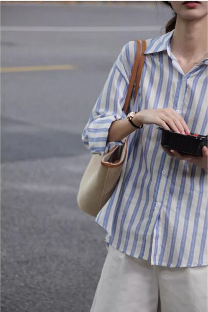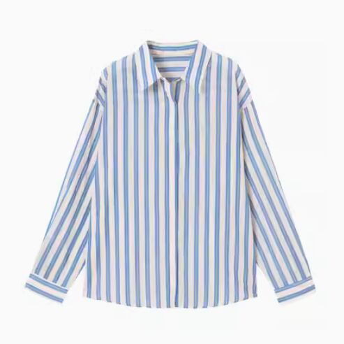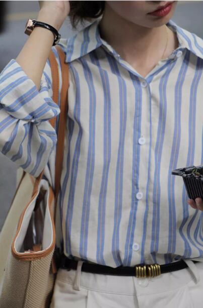 トップス シャツ レディース 長袖 襟付き スリム 細身 ストレート スマート 前開き ボタン ヴィンテージ かわいい 大人可愛い シンプル カジュアル 上品 おしゃれ かっこいい こなれ感 マニッシュ クール キュート 都会的 クラシカル ベーシック アメリカン 春 秋 冬 学生 学校 通学 女子会 休日 ショッピング 重ね着 韓国 オルチャン コーデ 普段使い 着回し 定番 S M L ブルー ストライプ柄