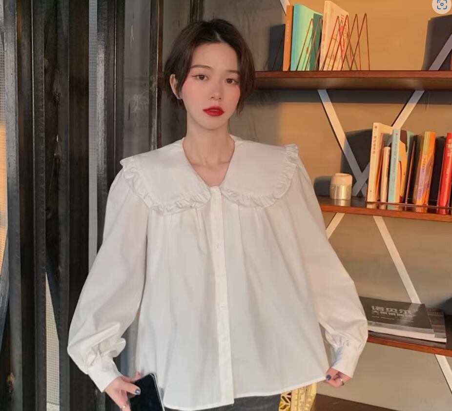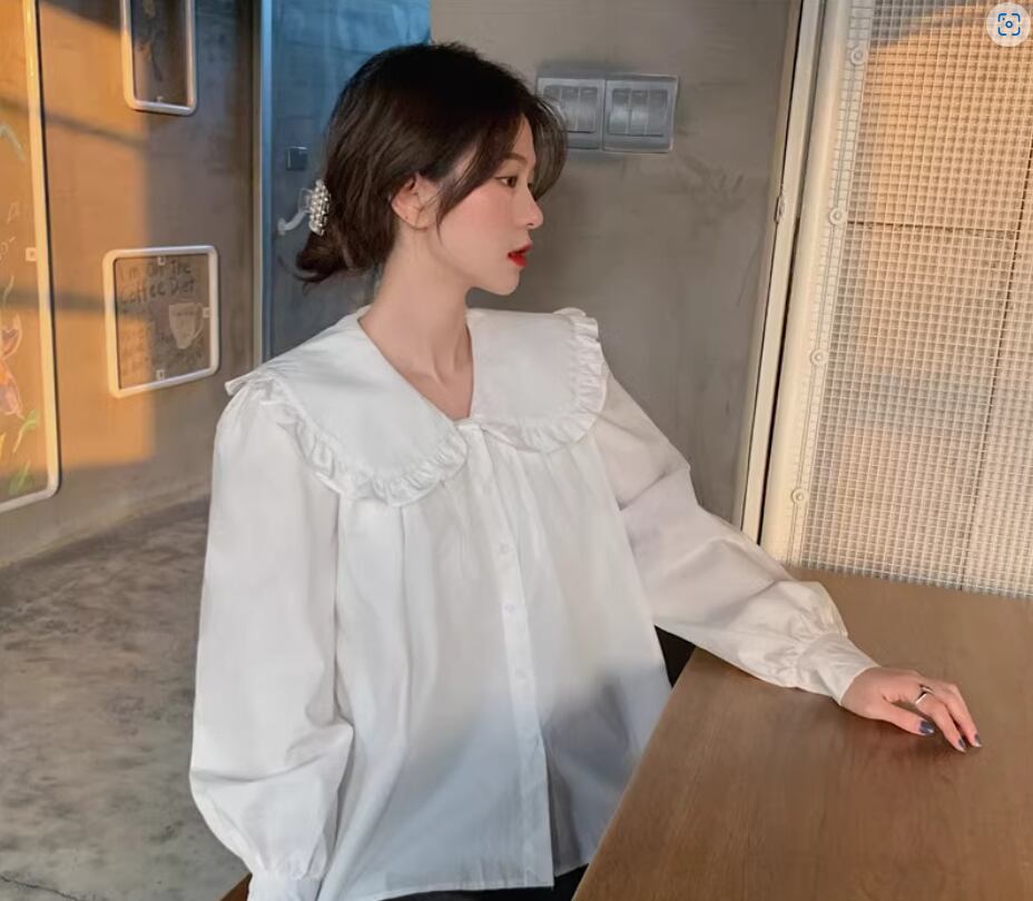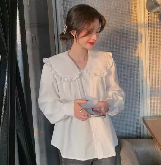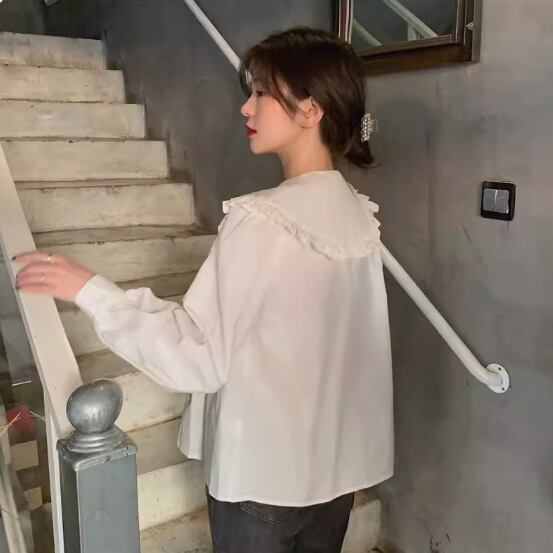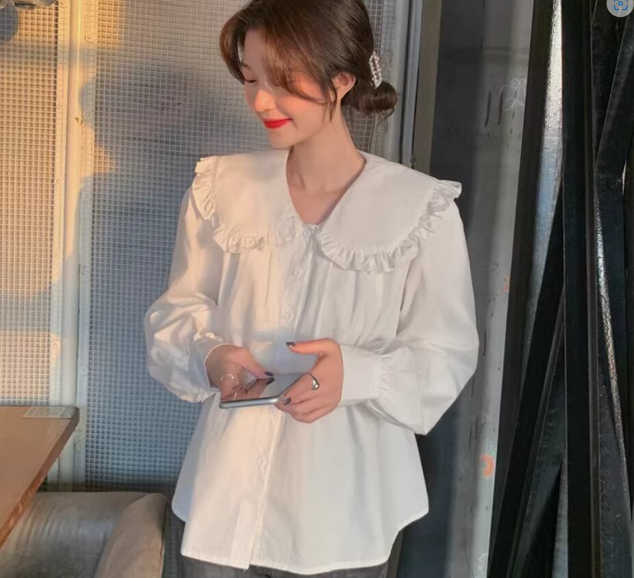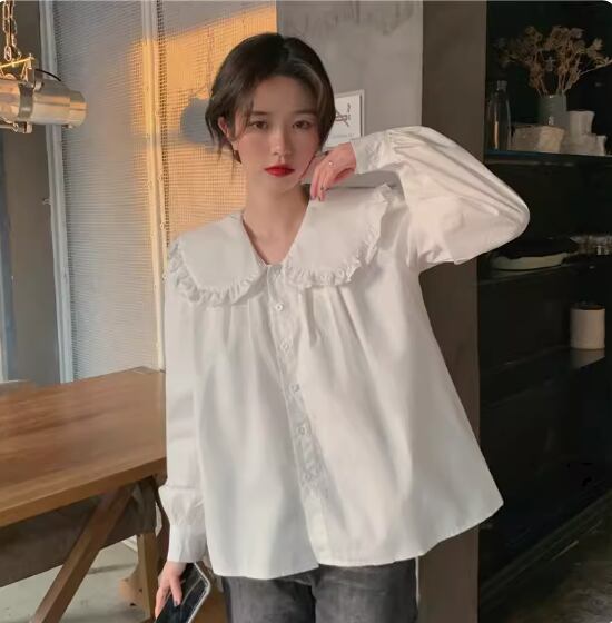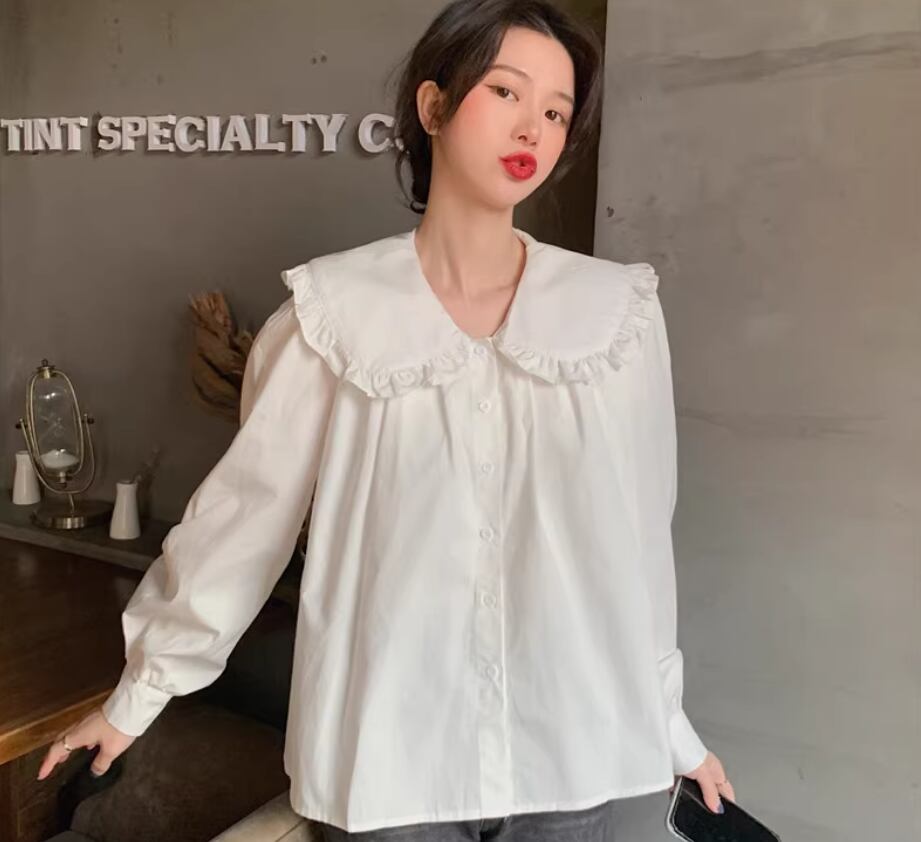 ビッグカラーブラウス トップス シャツ 白シャツ 白トップス 袖あり 長袖 襟付き ワイド 透け感 綿 かわいい 大人可愛い シンプル カジュアル おしゃれ お洒落 レトロ キュート 存在感 無地 春 夏 秋 冬 10代 20代 30代 40代 レディース 女性用 ママ お出かけ 休日 着回し 普段使い 重ね着 楽ちん L XL 2XL 白 ホワイト