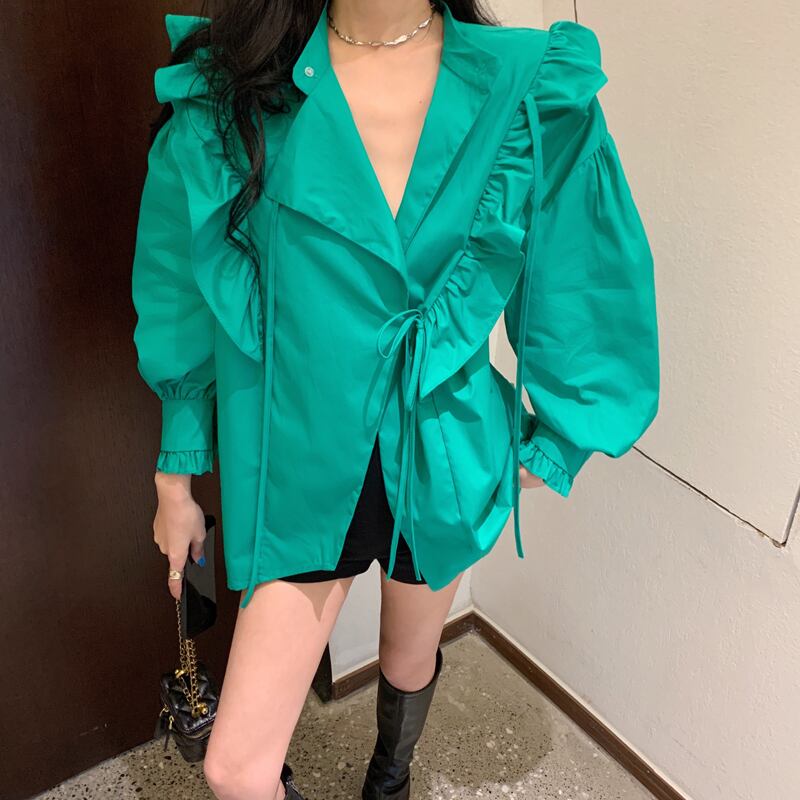 トップス シャツ ミディアム丈 長袖 ボリューム袖 ハイネック 前開き アシンメトリー フリル 薄手 かわいい 大人可愛い きれいめ シンプル 上品 おしゃれ かっこいい レトロ こなれ感 きちんと 個性的 主役級 存在感 抜け感 ラフ 春 夏 キュート ガーリー エレガント フォーマル レディース 女性用 ママ OL 通勤 学生 通学 デート お出かけ お泊まり イベント 女子会 休日 アウトドア カフェ ショッピング レストラン コンパ レイヤード 重ね着 普段使い 着回し S M L モテ