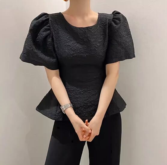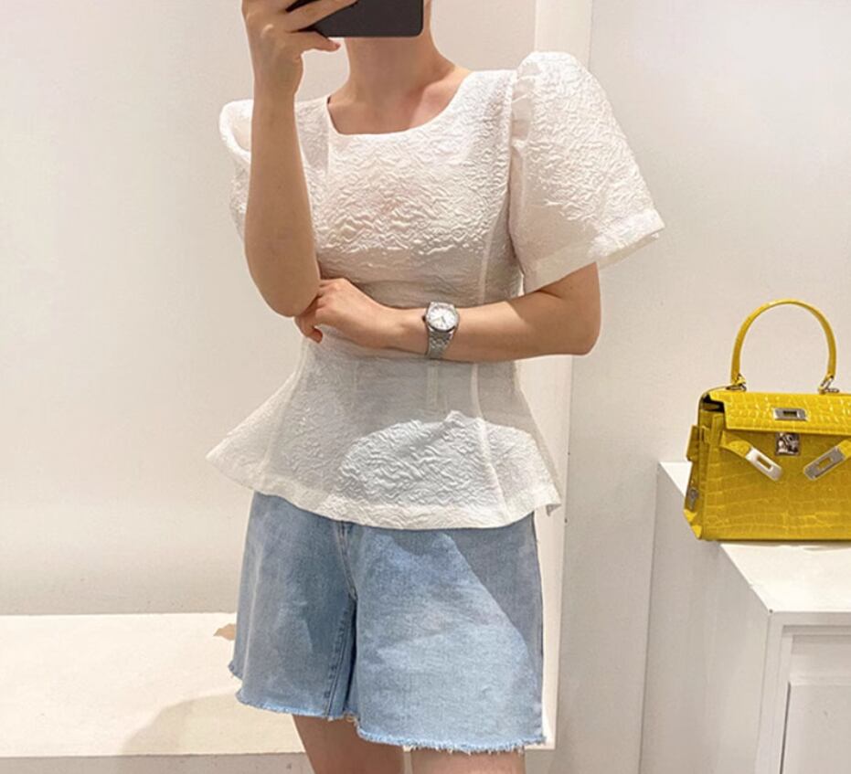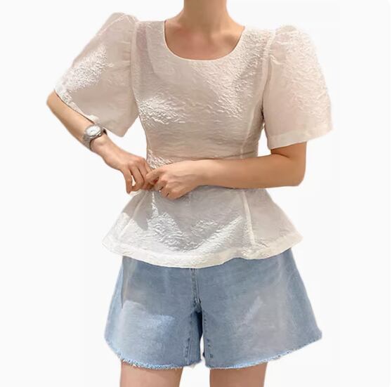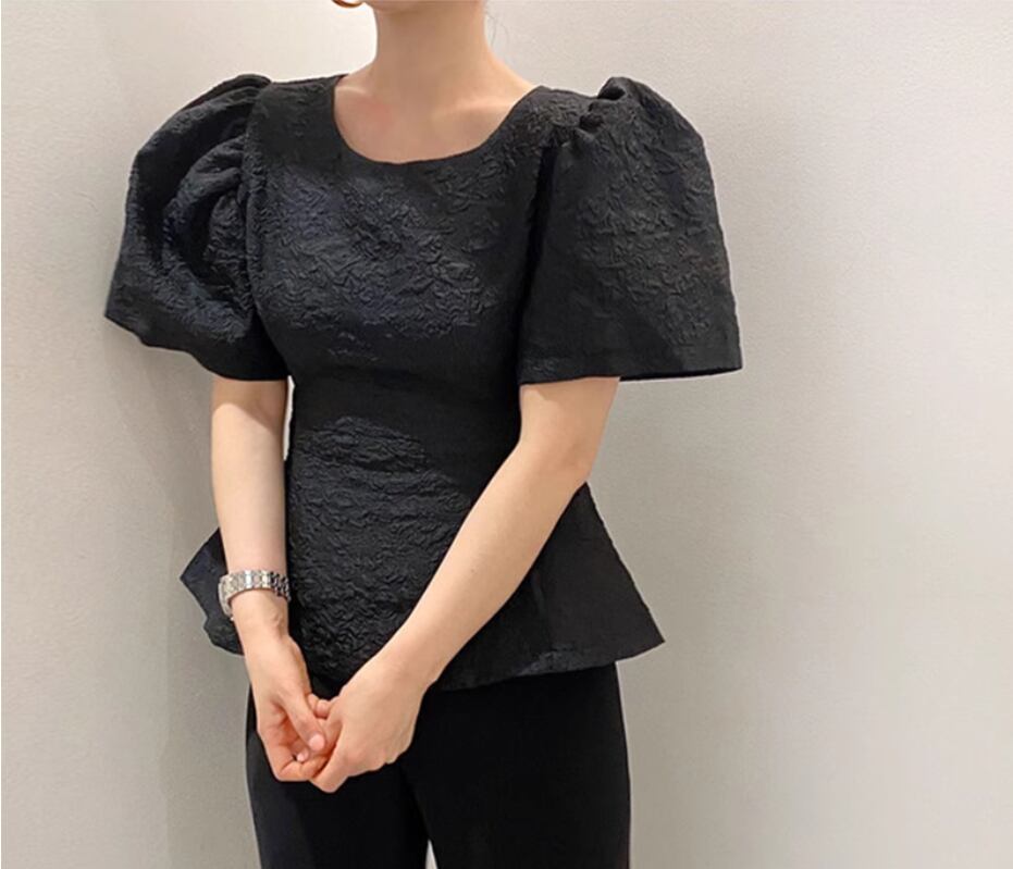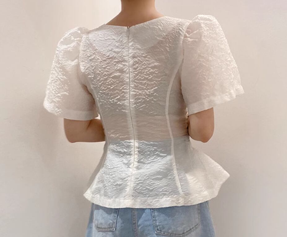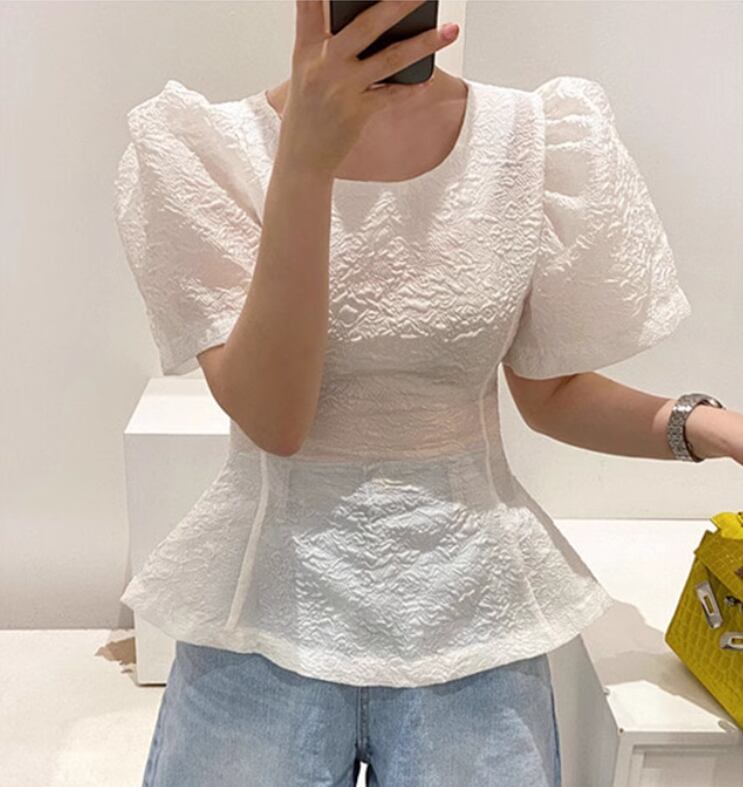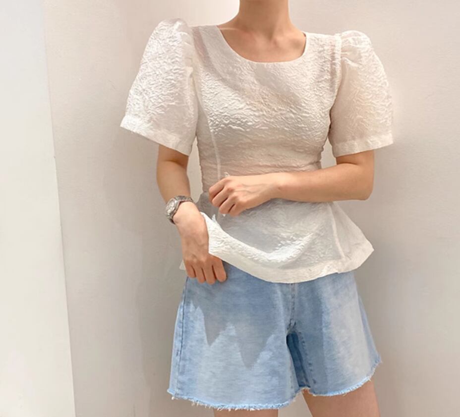 凹凸のある生地とパフスリーブが可愛い半袖ブラウス