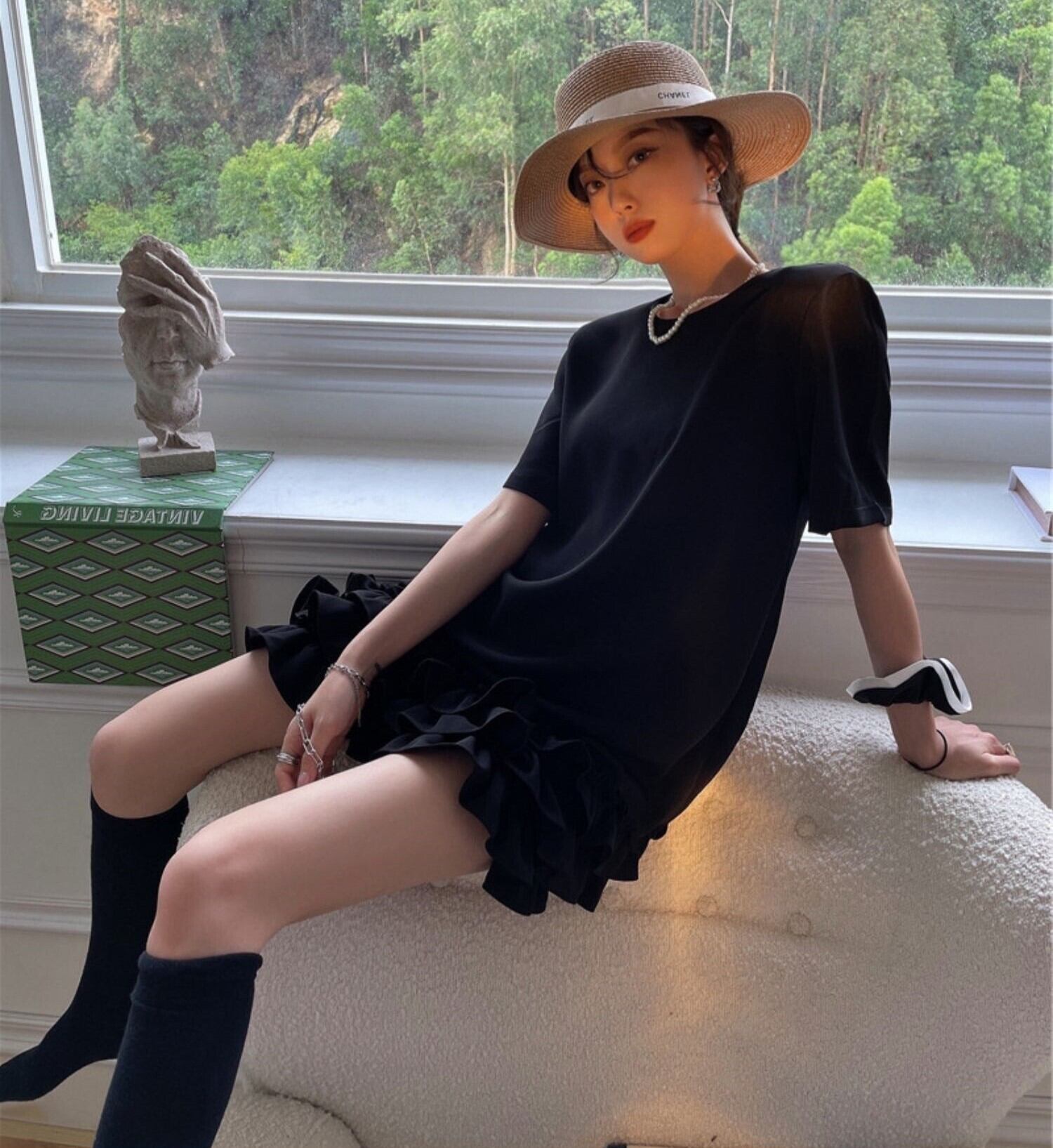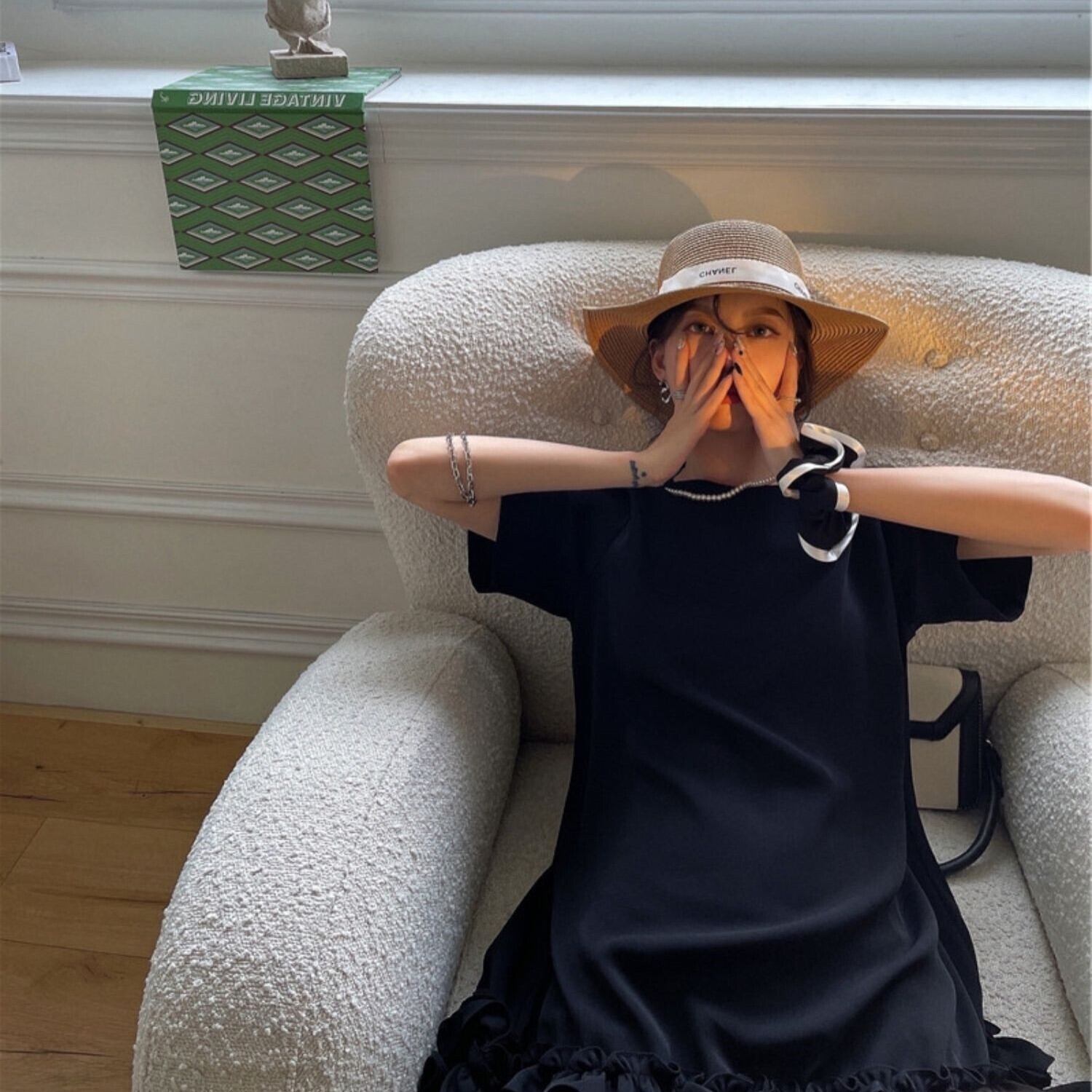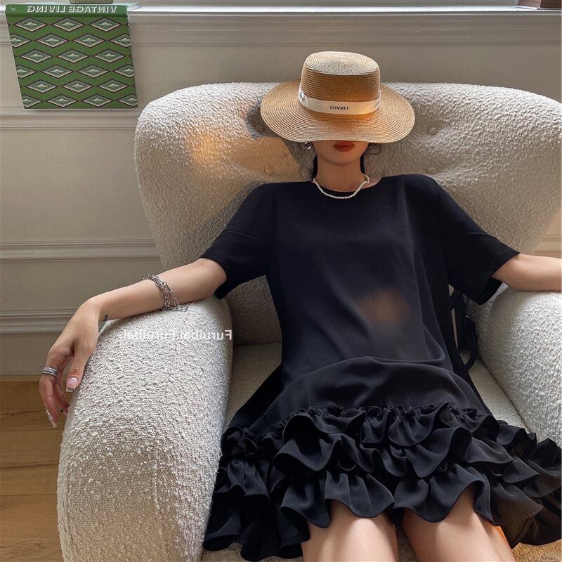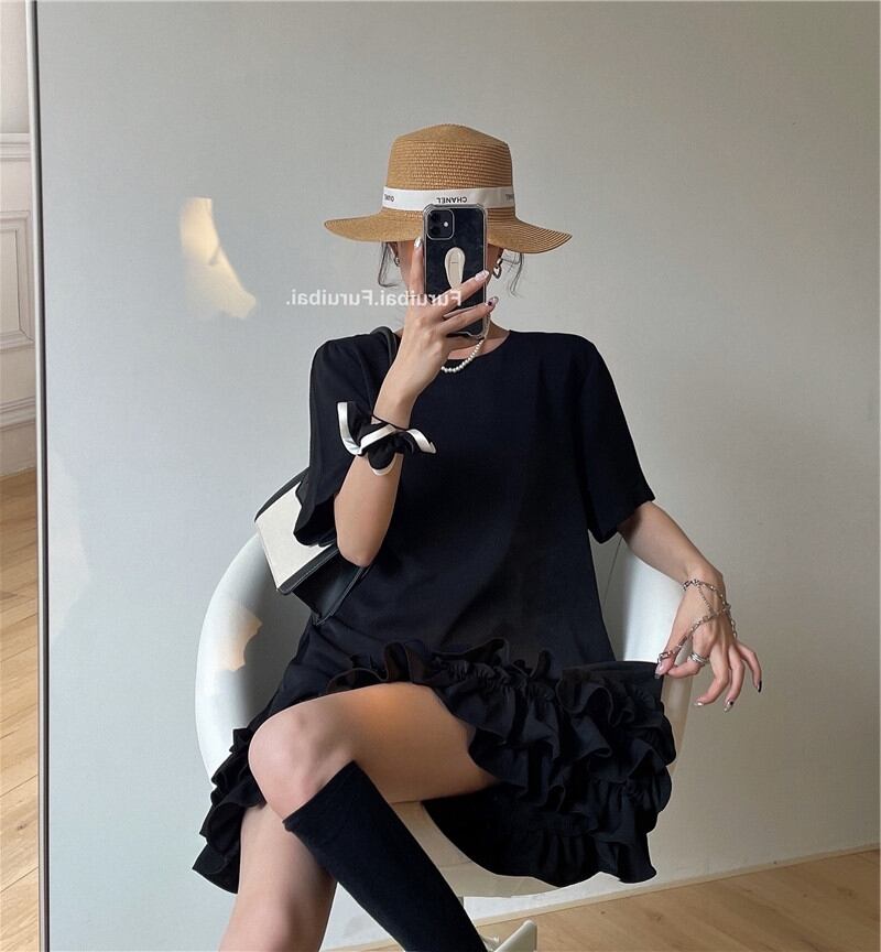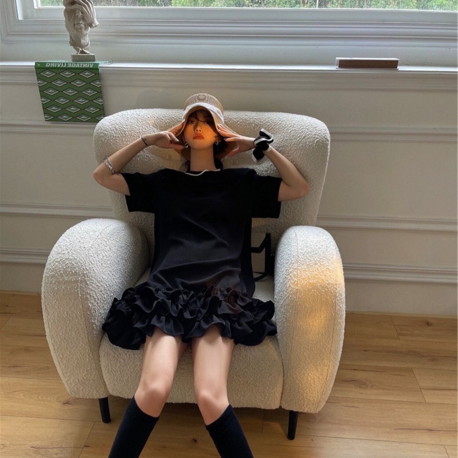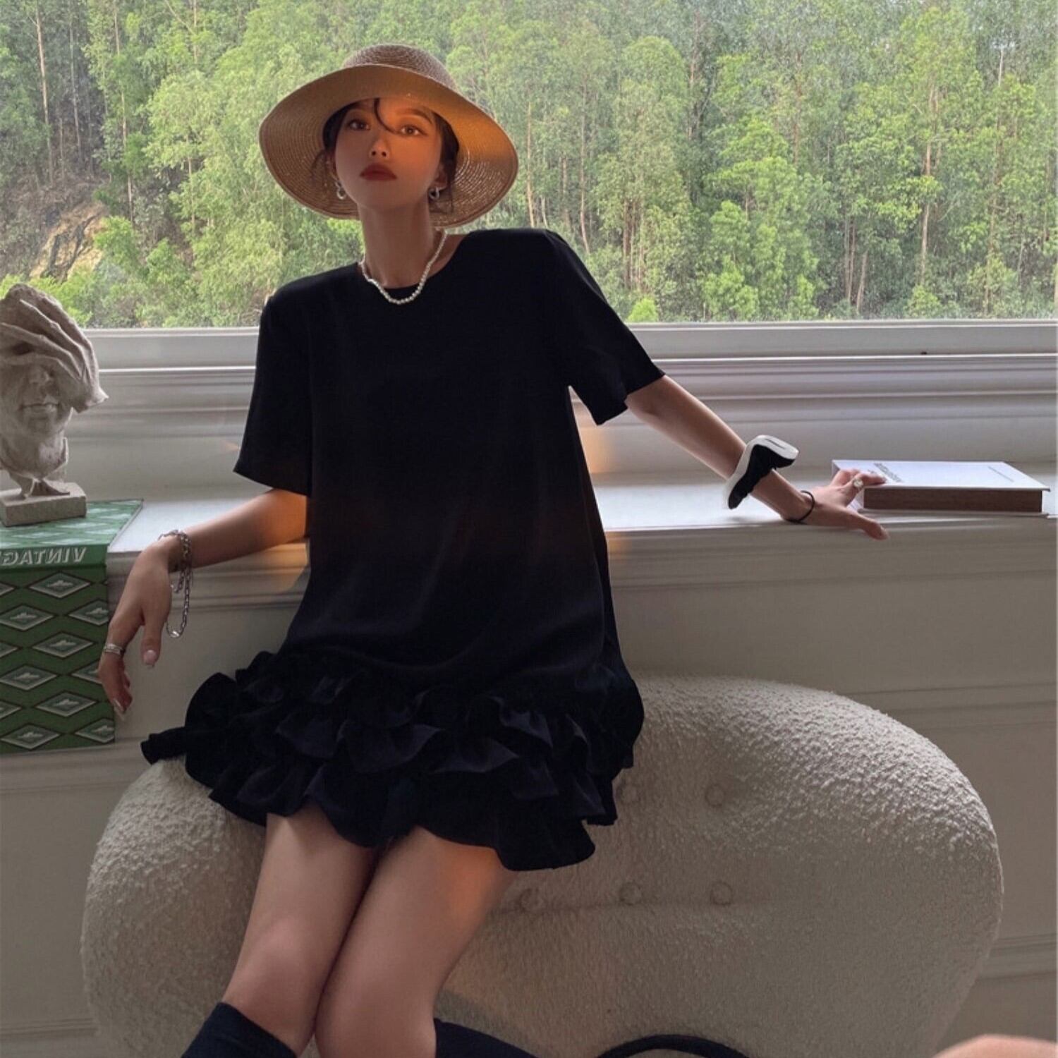 レディース ワンピース ケーキスカート ミモレ 半袖 ラウンドネック スリム 細身 Aライン フリル かわいい 大人可愛い きれいめ シンプル カジュアル おしゃれ こなれ感 ラフ ガーリー ルーズ ラブリー キュート 無地 春 夏 デート パーティー イベント 女子会 ショッピング カフェ 韓国 コーデ 楽ちん 体型カバー モテ トレンド 流行 インスタ映え S M L XL ゆったり ゆる ブラック