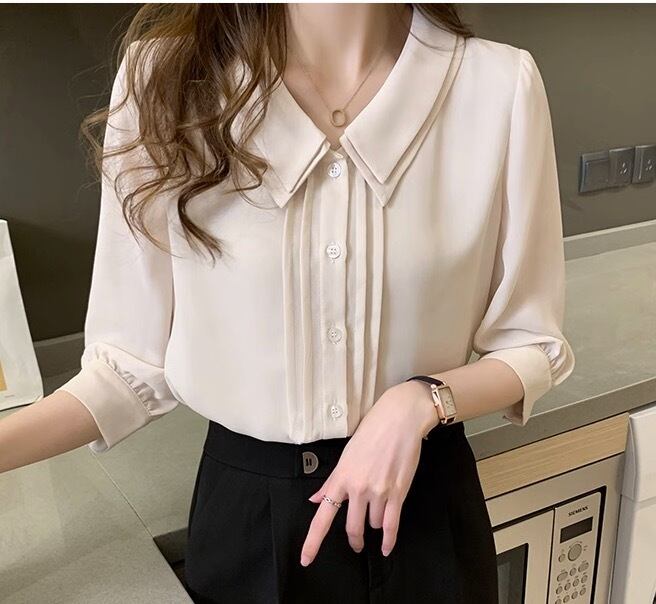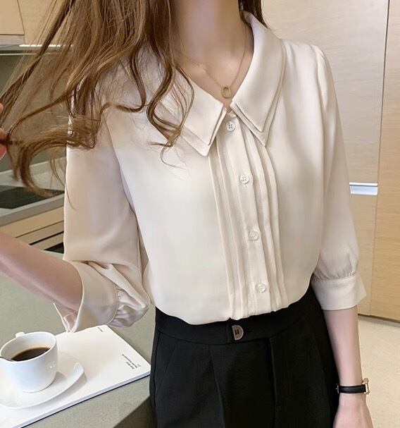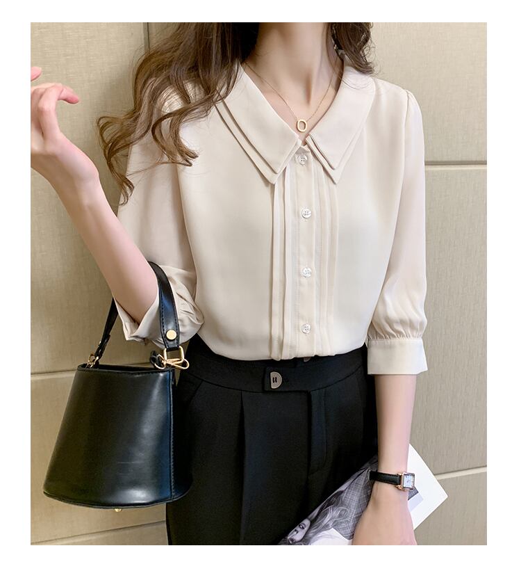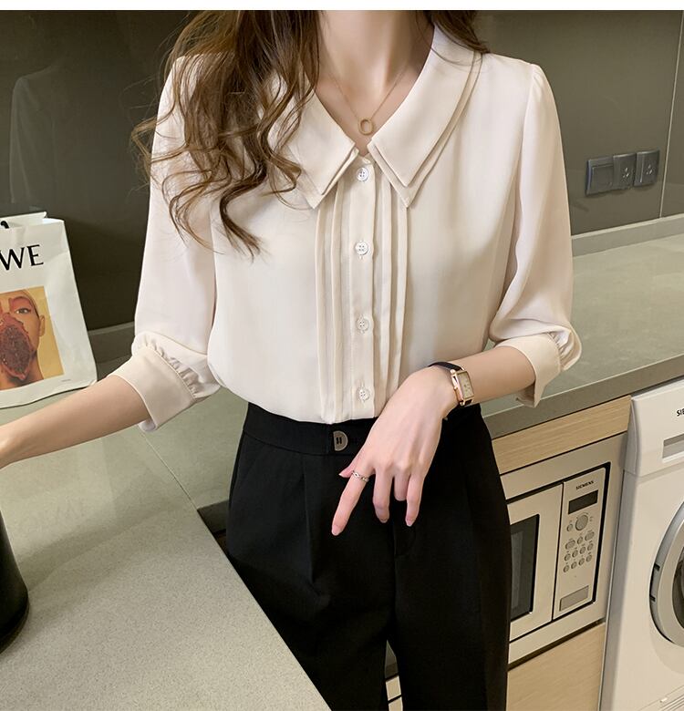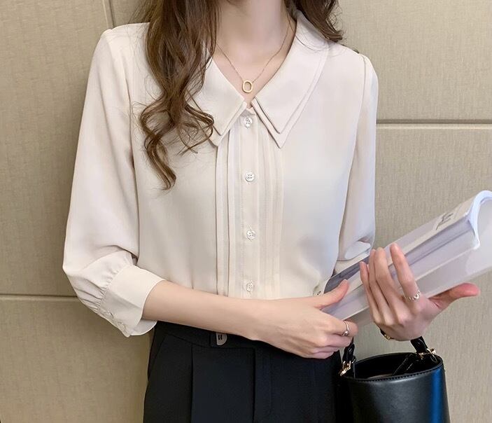 こちらは、レディーストップスの中でも人気のあるブラウスです。七分袖のフレアスリーブが、女性らしさを引き立てる一枚。シンプルながらも襟付きのデザインが上品さを演出し、着こなしに華を添えます。