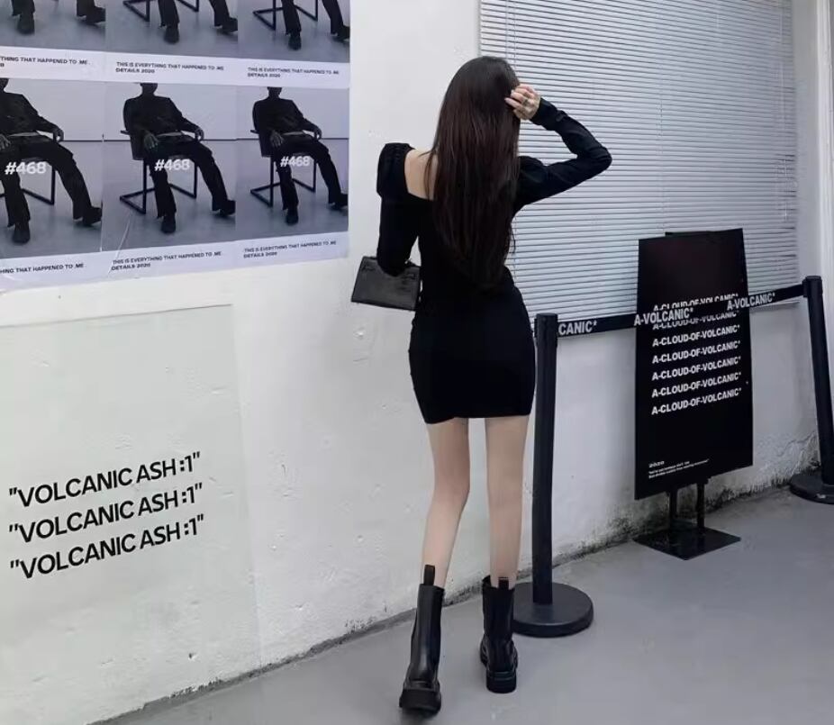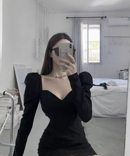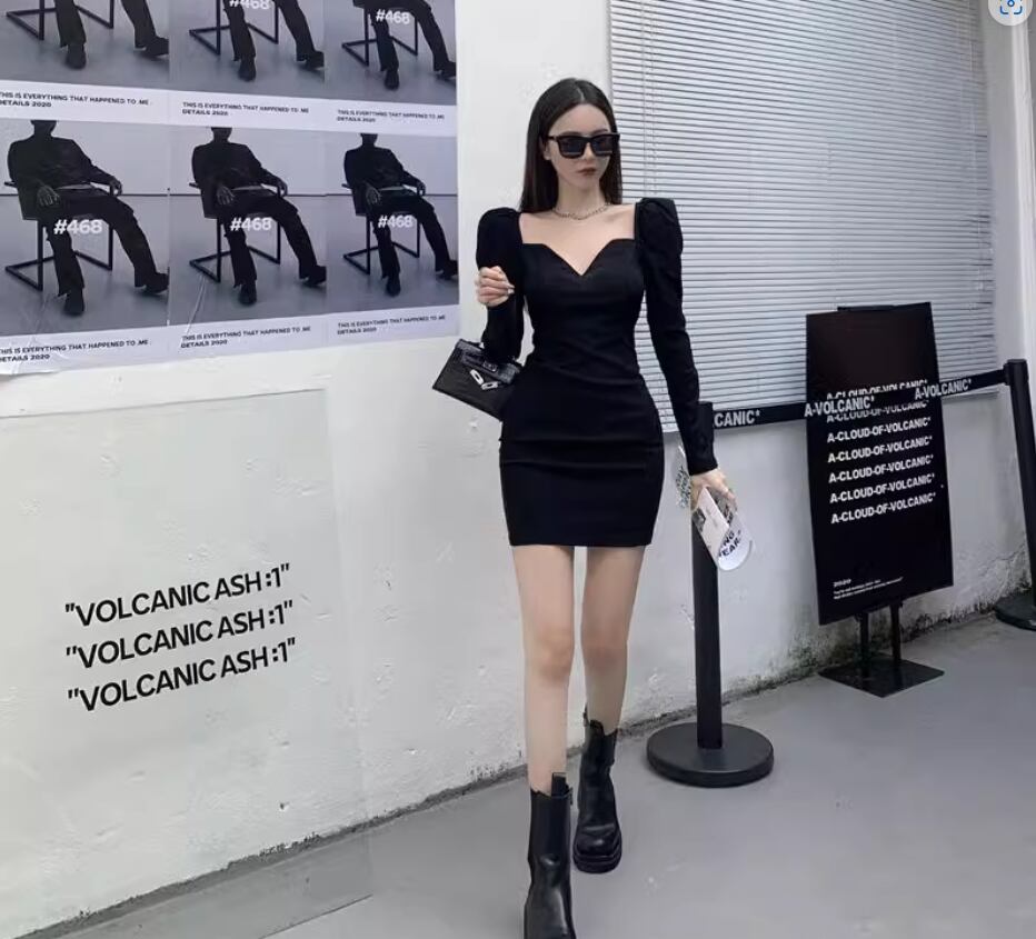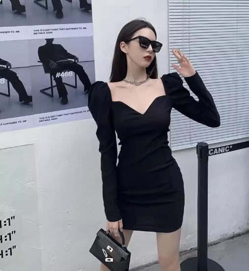 パフスリーブワンピース 袖あり パフスリーブ Vネック スクエアネック スリム 細身 きれいめ シンプル 大人 おしゃれ お洒落 かっこいい レトロ 大人女子 存在感 無地 春 夏 秋 冬 20代 30代 40代 レディース 女性用 デート お出かけ 休日 パーティー イベント 普段使い S M 黒 ブラック