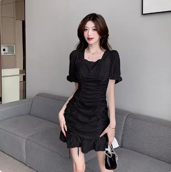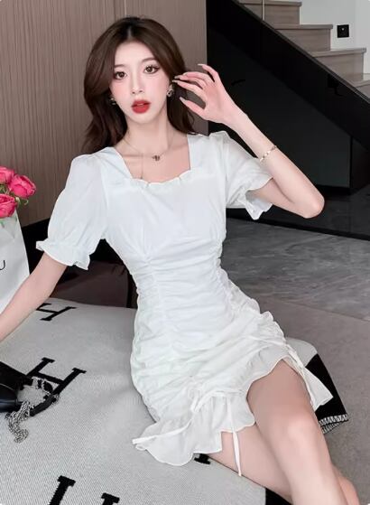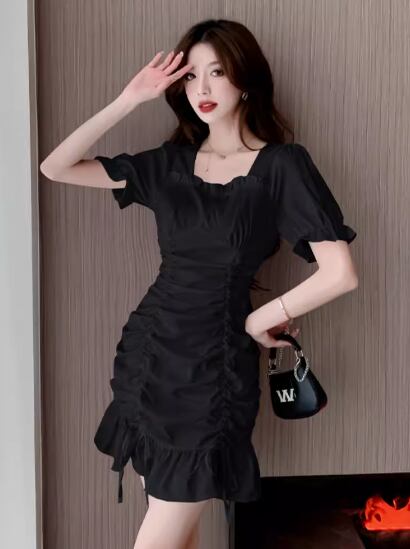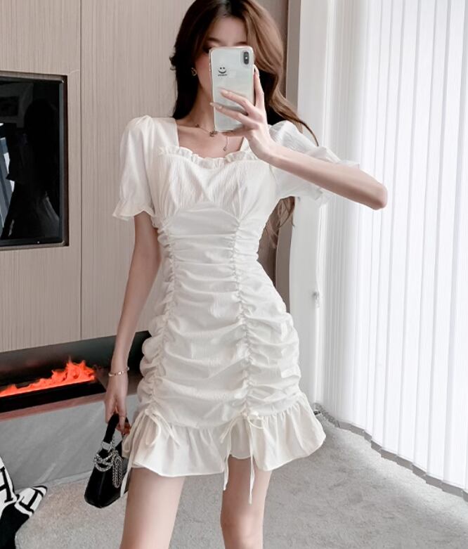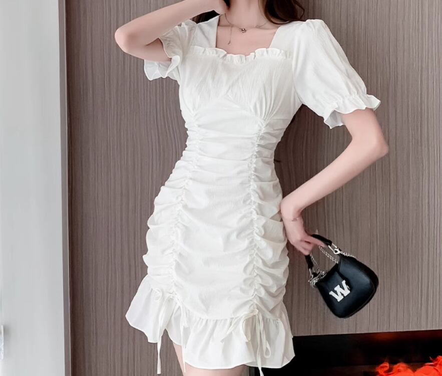 シャーリングデザインワンピース スクエアネック Aライン フリル かわいい 大人可愛い きれいめ シンプル 上品 おしゃれ お洒落 大人女子 こなれ感 無地 夏 10代 20代 30代 40代 レディース 女性用 普段使い S M L XL 白 ホワイト 黒 ブラック