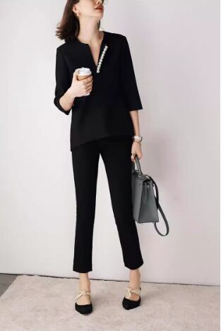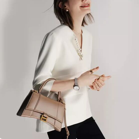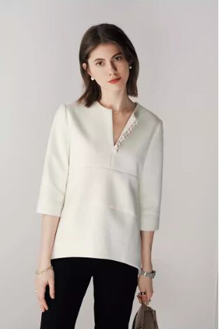 エレガントなVネックとキュートなパールボタンがポイントの大人可愛い5分袖ブラウス。薄手の素材で涼しく、女性らしい上品な印象を演出します。オフィスやお出かけ、ビジネスシーンまで幅広いシーンで活躍する一枚。