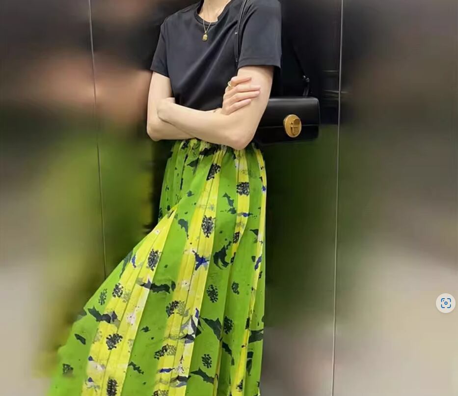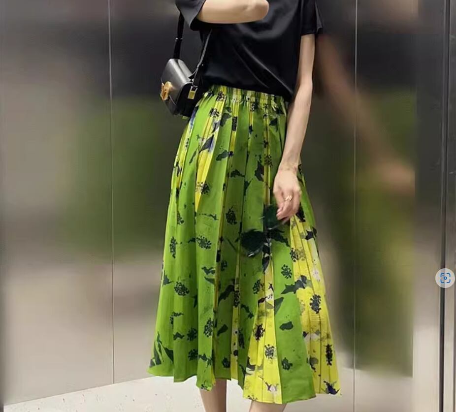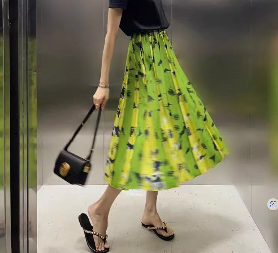 スカート ロングスカート プリーツスカート ミディアム丈 Aライン プリーツ ハイウエスト ウエストゴム 伸縮性 かわいい 大人可愛い カジュアル おしゃれ お洒落 大人女子 こなれ感 個性的 存在感 柄 春 夏 10代 20代 30代 40代 レディース 女性用 ママ お出かけ 休日 リゾート 旅行 海 着回し 普段使い 楽ちん S M L 緑 グリーン