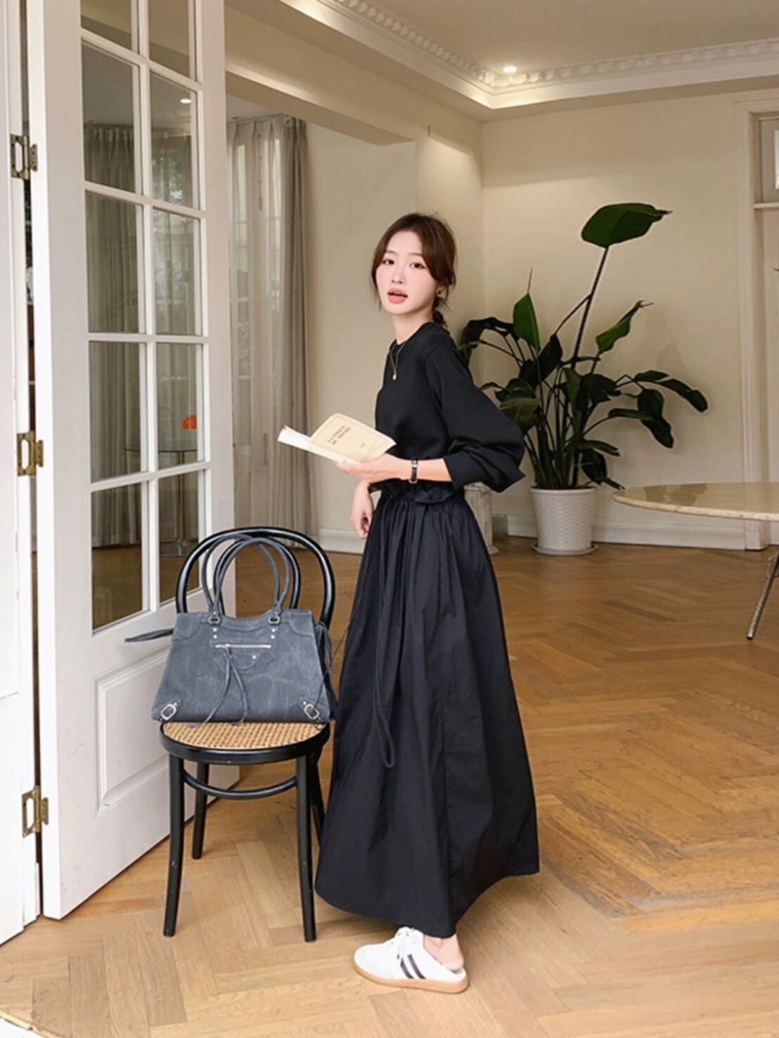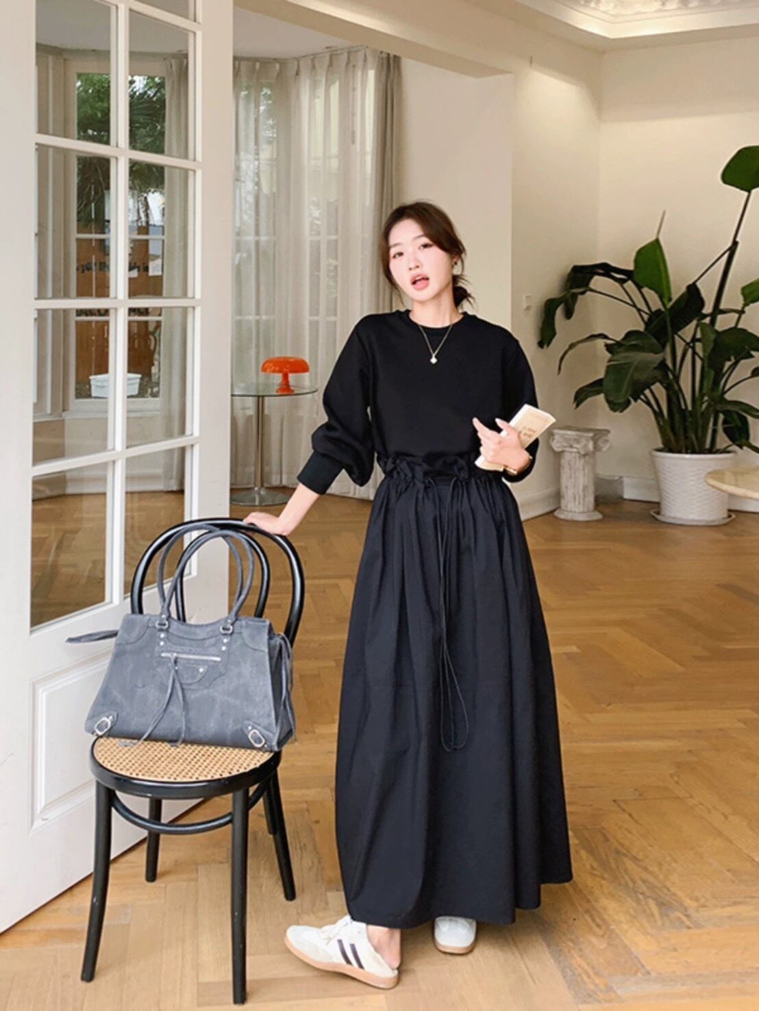 ワンピース レディース スカート ロング丈 Uネック 袖あり 長袖 膝下 ウエストリボン ハイウエスト 無地 シンプル ゆったり さらっと 体型カバー Aライン レトロガール 女の子らしい きれいめ 大人っぽい かわいい キュート 清楚 上品 大人 おしゃれ お洒落 レトロ こなれ感 ガーリー 個性的 主役級 存在感 抜け感 韓国っぽ オルチャン デート ママ 通学 学校 女子会 お出かけ 休日 着回し お揃い 20代 30代 40代 春 秋 冬 フリーサイズ ブラック