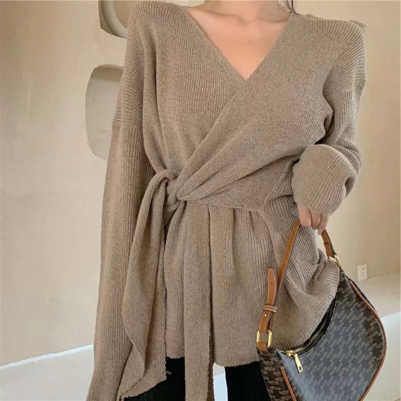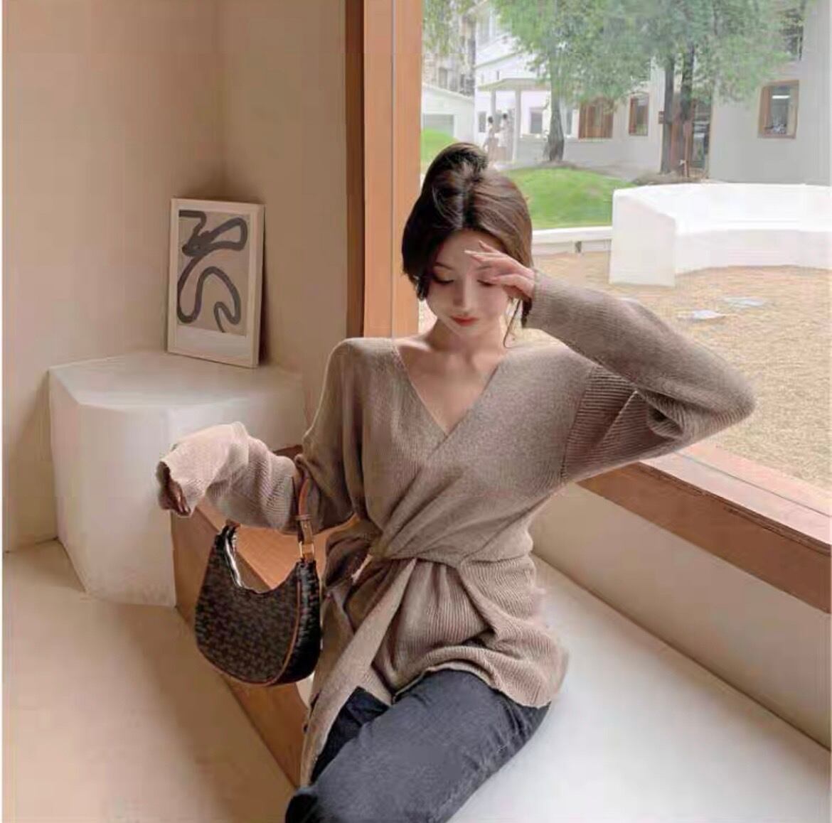 Vネックで女性らしい印象のニットソー。上品でかわいいデザイン。