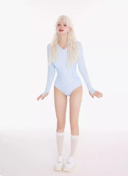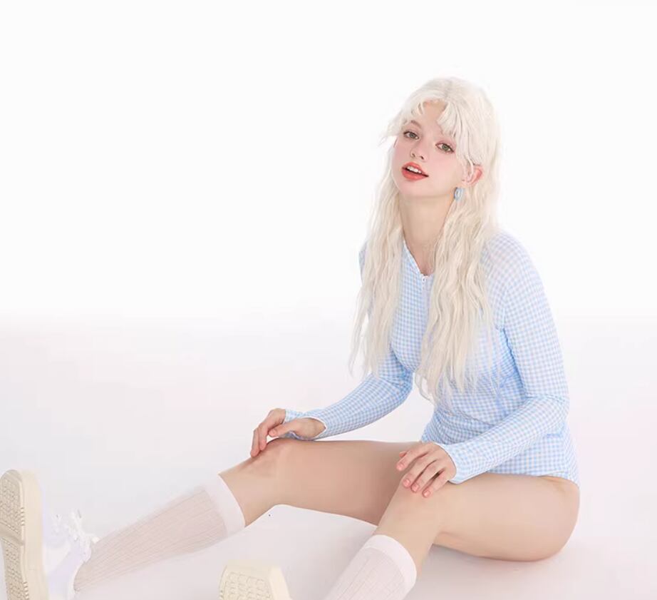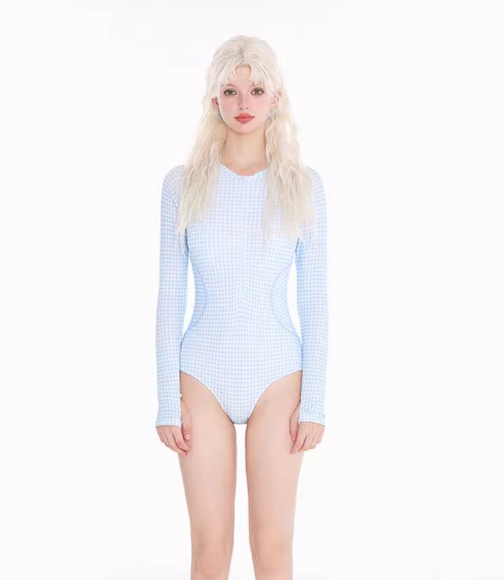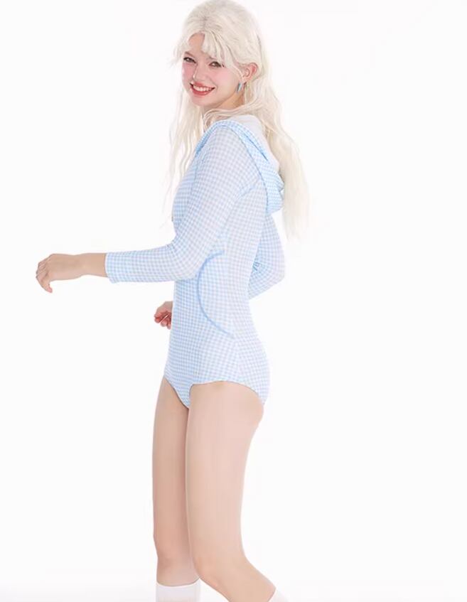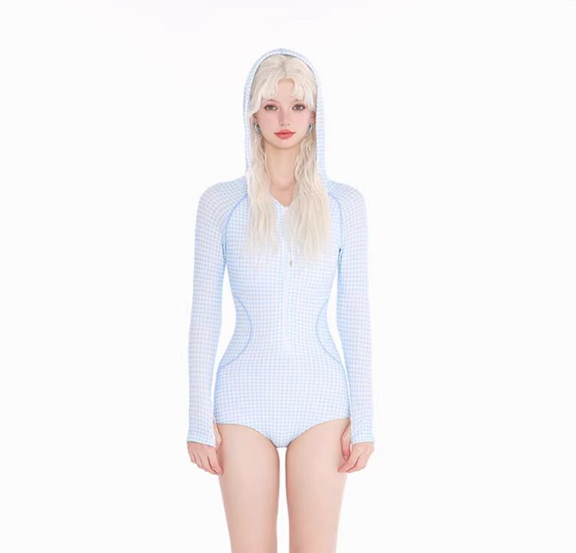 ギンガムチェック柄水着 フード付き フードなし 水着 スイムウェア ワンピース 長袖 かわいい レトロ 存在感 キュート 個性的 チェック柄 10代 20代 レディース 女性用 女の子 夏 海 ビーチ プール 旅行 M L XL 水色 ライトブルー